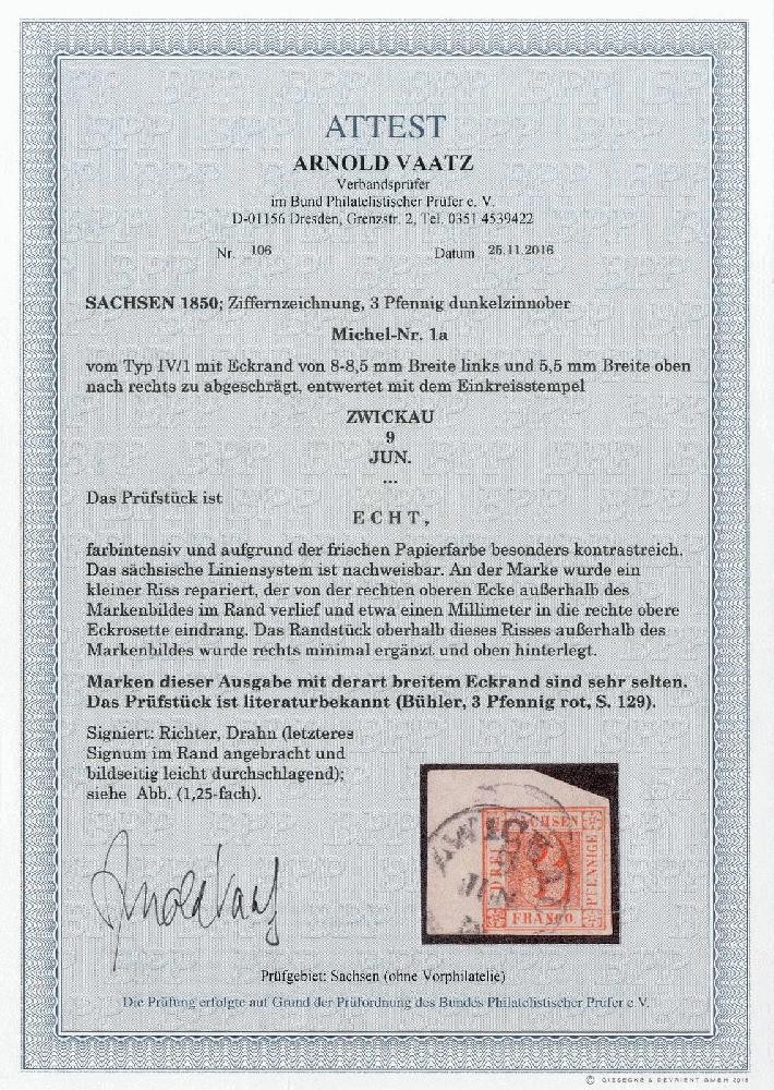 | Zusatzinformationen und Suchstichworte: | 228. Karl Pfankuch & Co Auktion Auktionstermin: 6. - 7. April 2022 Los 860 Altdeutschland Sachsen 3 Pfg. dunkelzinnoberrot, Type IV/1, farbtiefes Exemplar mit ca. 8 mm breiten Rändern der linken oberen Bogenecke (äußerst selten), sauber mit K1 ZWICKAU, eine minimale Korrektur an der rechten oberen Ecke sollte toleriert werden, sign. Richter, Drahn, Atteste Rismondo und Vaatz. Literaturbekannte Altdeutschland-Rarität (Bühler, 3 Pfennig rot, S.129). Zuschlag 4.000,00 EUR |