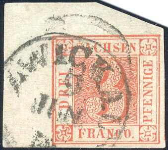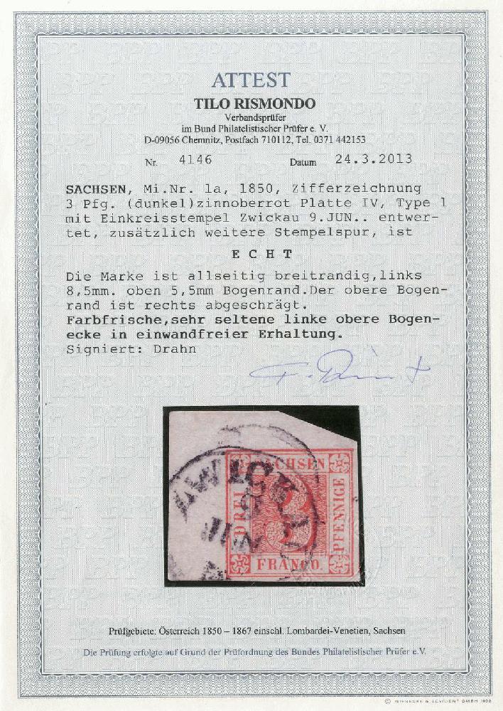 | Zusatzinformationen und Suchstichworte: | 228. Karl Pfankuch & Co Auktion Auktionstermin: 6. - 7. April 2022 Los 860 Altdeutschland Sachsen 3 Pfg. dunkelzinnoberrot, Type IV/1, farbtiefes Exemplar mit ca. 8 mm breiten Rändern der linken oberen Bogenecke (äußerst selten), sauber mit K1 ZWICKAU, eine minimale Korrektur an der rechten oberen Ecke sollte toleriert werden, sign. Richter, Drahn, Atteste Rismondo und Vaatz. Literaturbekannte Altdeutschland-Rarität (Bühler, 3 Pfennig rot, S.129). Zuschlag 4.000,00 EUR |