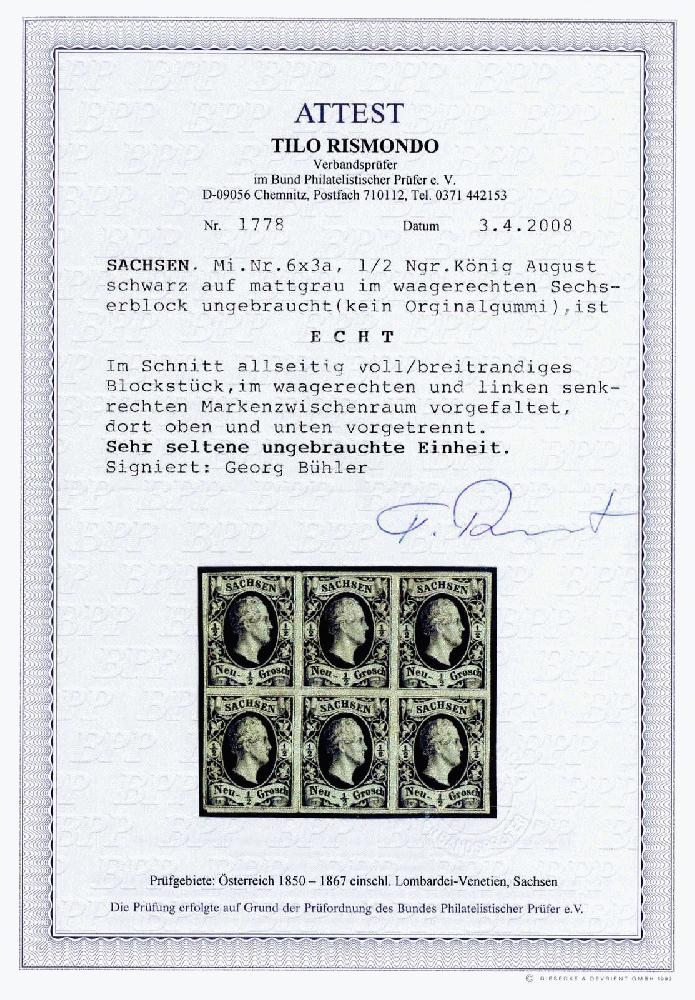 | Zusatzinformationen und Suchstichworte: | 228. Karl Pfankuch & Co Auktion Auktionstermin: 6. - 7. April 2022 Los 863 Altdeutschland Sachsen 1/2 Ngr. a. mattgrau, voll- bis breitrandiger Pracht-Sechserblock mit nicht orginalem Gummi (teils im Zwischenraum vorgefaltet), It. Fotoattest Rismondo BPP "eine sehr seltene ungebrauchte Einheit". Ausruf 800,00 EUR |