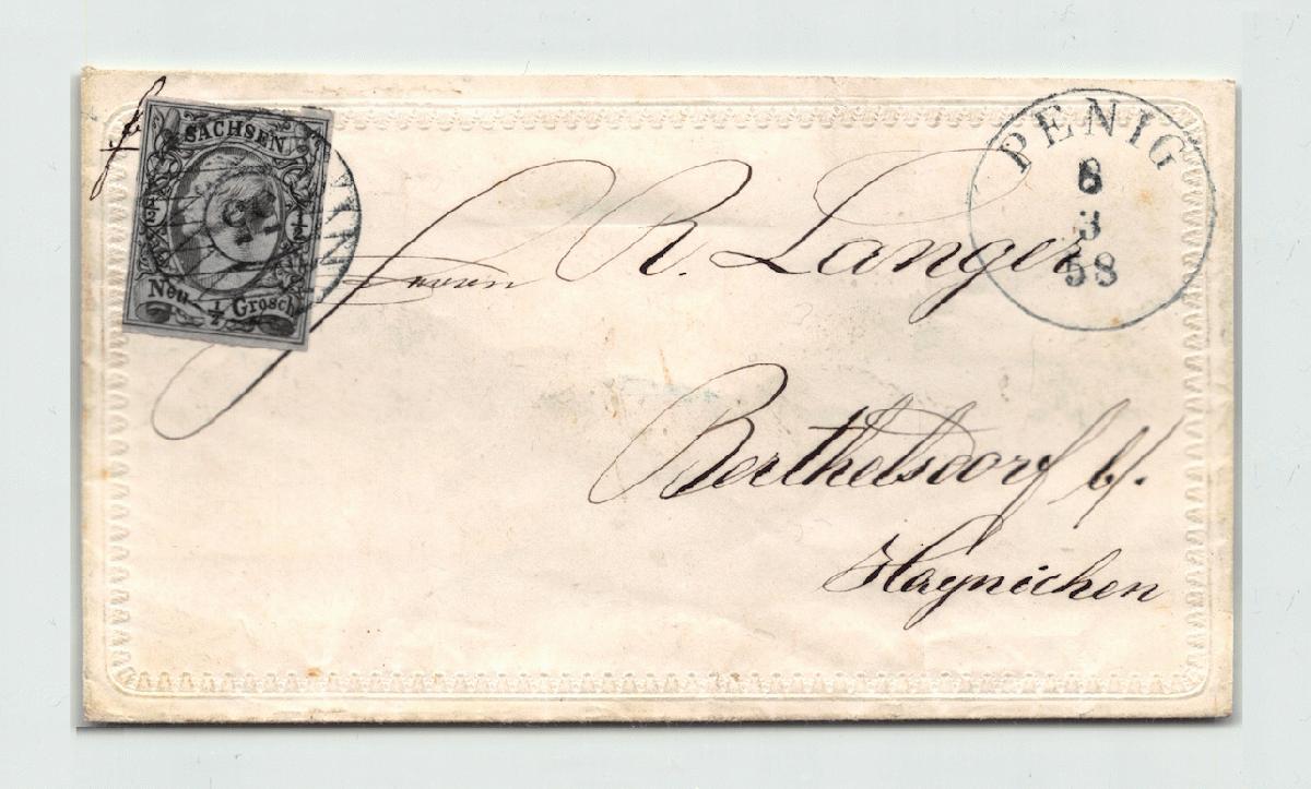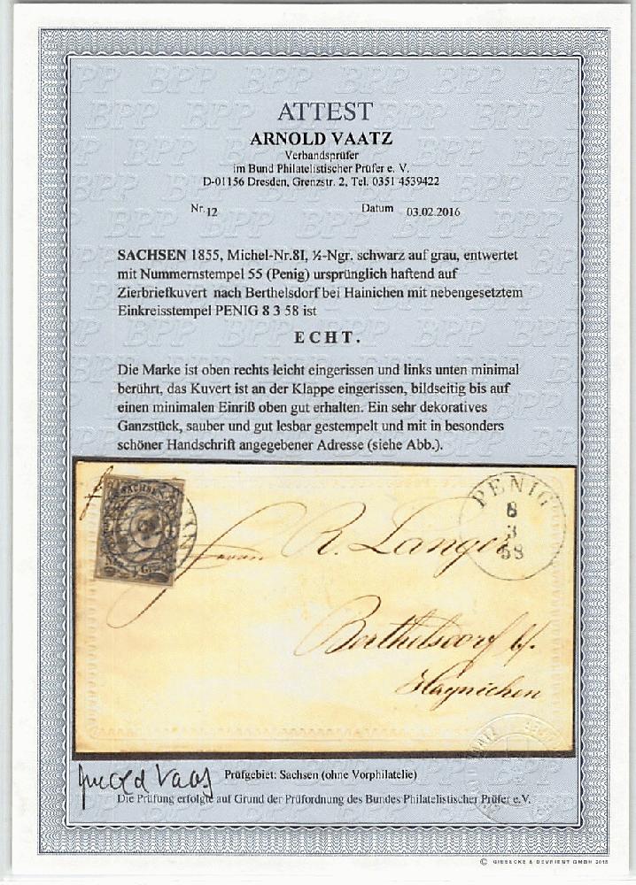 | Zusatzinformationen und Suchstichworte: | Alexander Voigt Briefmarkenhandel Los 0000101716 Altdeutschland Sachsen 1/2 Ngr. schwarz auf mattgrau, Type I, oben leichter Einriß, links unten minimal berührt bzw. lupen- bis breitrandig mit Nummernstempel "55" und akkurat nebengesetztem Aufgabe-K1 "PENIG 8.3.58" auf sehr attraktivem Präge-Zierbrief nach Berthelsdorf bei Haynichen (Hainichen). Rückseitig Ausgabe-K1 "2. AUSGABE, 9/III". Fotoattest Vaatz BPP: "Ein sehr dekoratives Ganzstück, sauber und gut lesbar gestempelt und mit in besonders schöner Handschrift angegebener Adresse.". Festpreis 250,00 EUR |