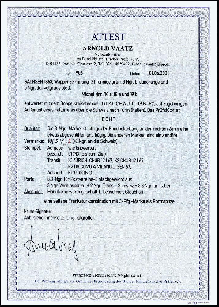 | Zusatzinformationen und Suchstichworte: | Rauhut & Kruschel - 212. Auktion Auktionstermin: 30. Juli 2022 Los 1474 Altdeutschland Sachsen 3 Pfg. grün nebst 3 Ngr. braunorange und 5 Ngr. dunkelgrauviolett auf Faltbrief in der 2. Gewichtsstufe nach Turin, K2 "Glauchau" (3 Ngr. Zhg. oben min. bestoßen). Seltene Frankatur-Kombination mit der 3-Pfg.-Marke als Portospitze, Fotoattest Vaatz Ausruf 700,00 EUR |