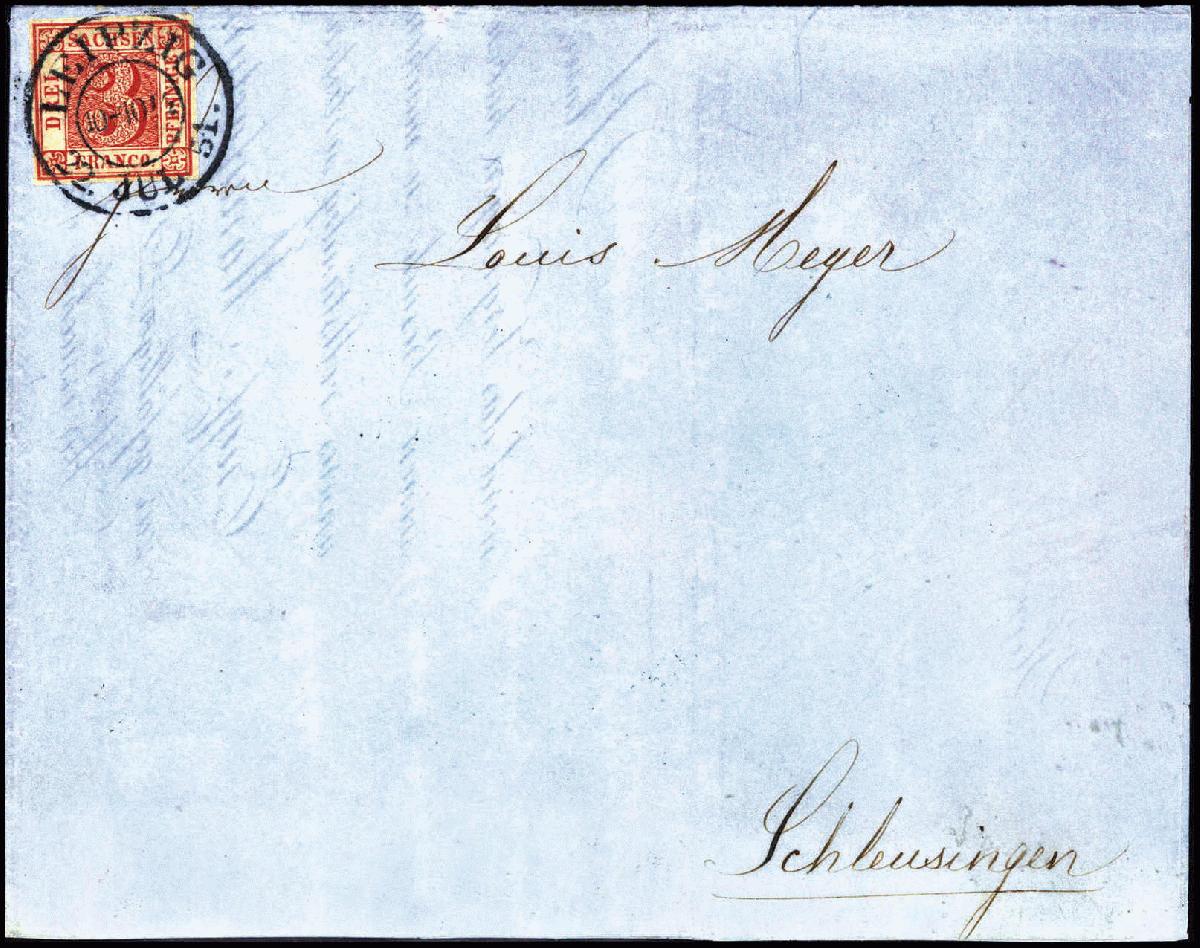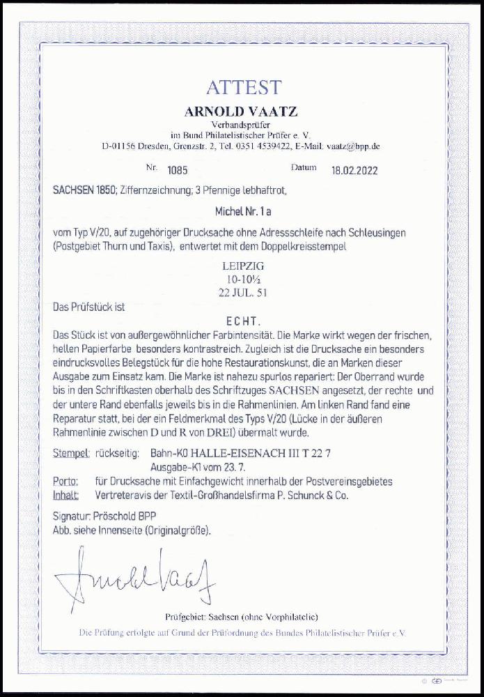 | Zusatzinformationen und Suchstichworte: | Württembergisches Auktionshaus 140. Versteigerung Auktionstermin: 17. - 18. Juni 2022 Los 2757 Altdeutschland Sachsen 3 Pfg. lebhaftrot, Platte V, Type 20, leuchtend farbfrisches Exemplar (sauber ausgebessert) auf blauer Drucksache ohne Schleife nach Schleusingen, besonders klar und zentr. aufges. K2 LEIPZIG 22 JUL. 51. Sehr schönes Ganzstück dieser beliebten Marke, sign. Pröschold BPP, Fotoattest Vaatz BPP. Katalogpreis: 25.000,- Zuschlag 2.700,00 EUR |
