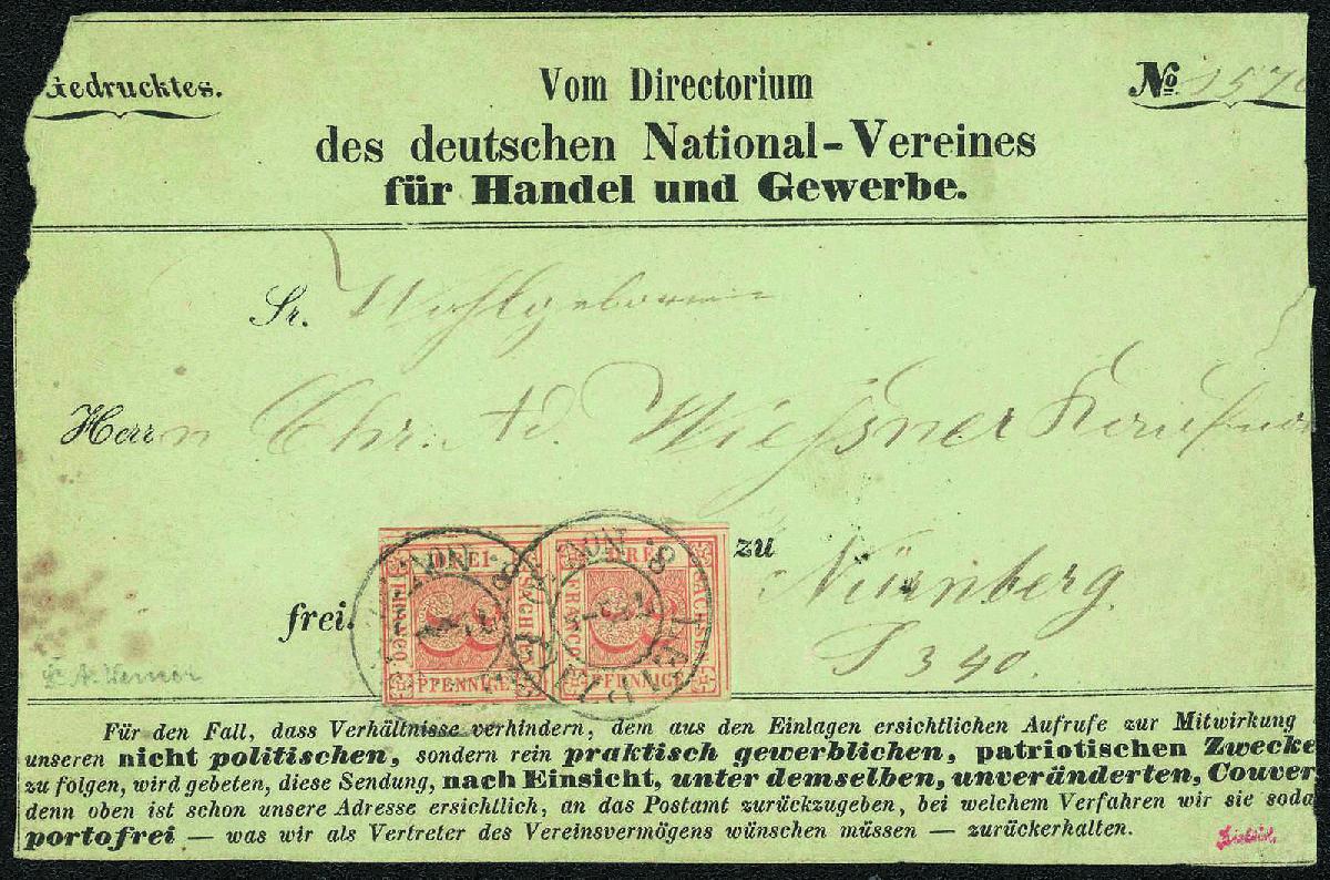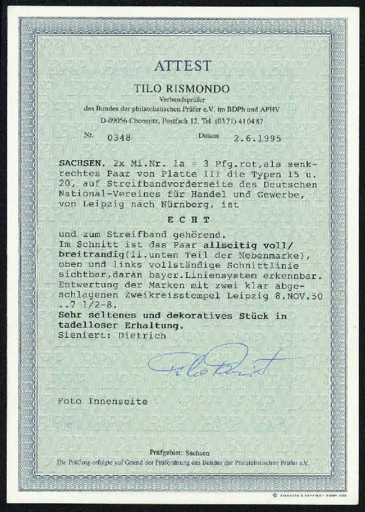 | Zusatzinformationen und Suchstichworte: | Gert Müller 114. Auktion Auktionstermin: 25. Mai 2022 Los 2845 Altdeutschland Sachsen 3 Pfg. rot, der legendäre "SACHSENDREIER", ein wundervoll farbfrisches, allseits voll- bis überrandiges senkrechtes Luxuspaar, Platte III, Typen 15 und 20, auf Streifband-Vorderseite mit zwei klaren K2 "LEIPZIG 8.NOV.50." nach Nürnberg. Das Paar zeigt links deutlich erkennbares bayrisches Liniensystem. Eine Sachsen-Rarität für die große Sammlung! Fotoattest "SEHR SELTENES UND DEKORATIVES STÜCK IN TADELLOSER ERHALTUNG" Rismondo BPP. Ausruf 20.000,00 EUR |