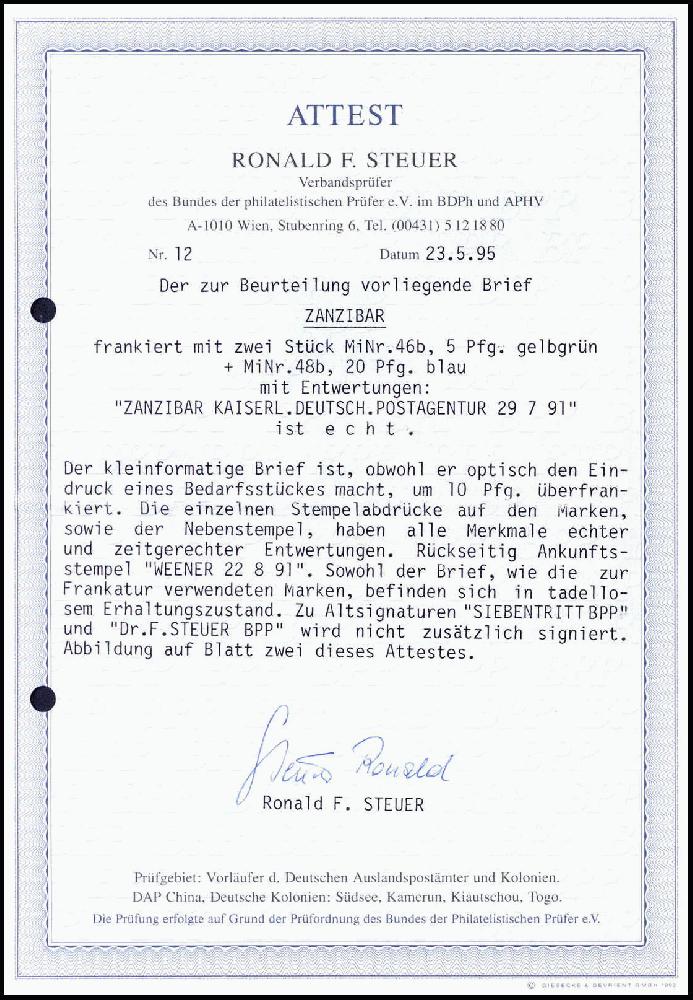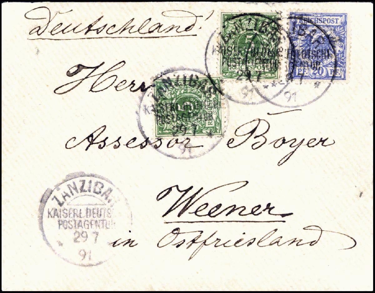 | Zusatzinformationen und Suchstichworte: | Württembergisches Auktionshaus 140. Versteigerung Auktionstermin: 18. Juni 2022 Los 6124 Deutsche Kolonien Ostafrika, Vorläufer Sansibar 5 Pfg., zwei Exemplare mit 20 Pfg. ultramarin auf schönem, tadellosem kl. Brief nach Deutschland, vier volle Stempel ZANZIBAR KDPA 29/7 91 (zwei Tage vor Schließung der Deutschen Post auf Zanzibar). Eine denkbar ungewöhnliche Frankatur-Kombination und ein attraktiver, seltener Brief, ex Slg. Siebentritt, Fotoattest Steuer BPP. Ausruf 1.500,00 EUR |