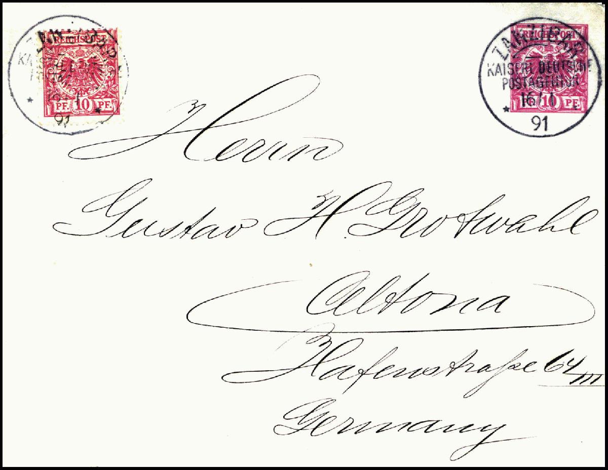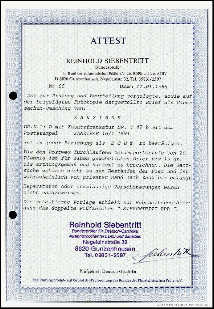 | Zusatzinformationen und Suchstichworte: | Württembergisches Auktionshaus 140. Versteigerung Auktionstermin: 18. Juni 2022 Los 6125 Deutsche Kolonien Ostafrika, Vorläufer Sansibar Großformat-Ganzsachenumschlag in Zanzibar verwendet: 10 Pfg., tadelloses Exemplar als Zusatzfrankatur auf perfekt erhaltenem Ganzsachenumschlag 10 Pfg. karminrosa (Großformat) mit zwei sauber aufges. Stempeln ZANZIBAR KDPA 16/7 91. Die 10-Pfg.-Umschläge im Großformat gehörten nicht zu den Beständen der Deutschen Postagentur auf Zanzibar, offenbar wurde der Umschlag privat dorthin verbracht und dann aufgegeben. Ein sehr seltenes Ganzstück, Fotoattest Siebentritt BPP. Ausruf 1.500,00 EUR |