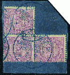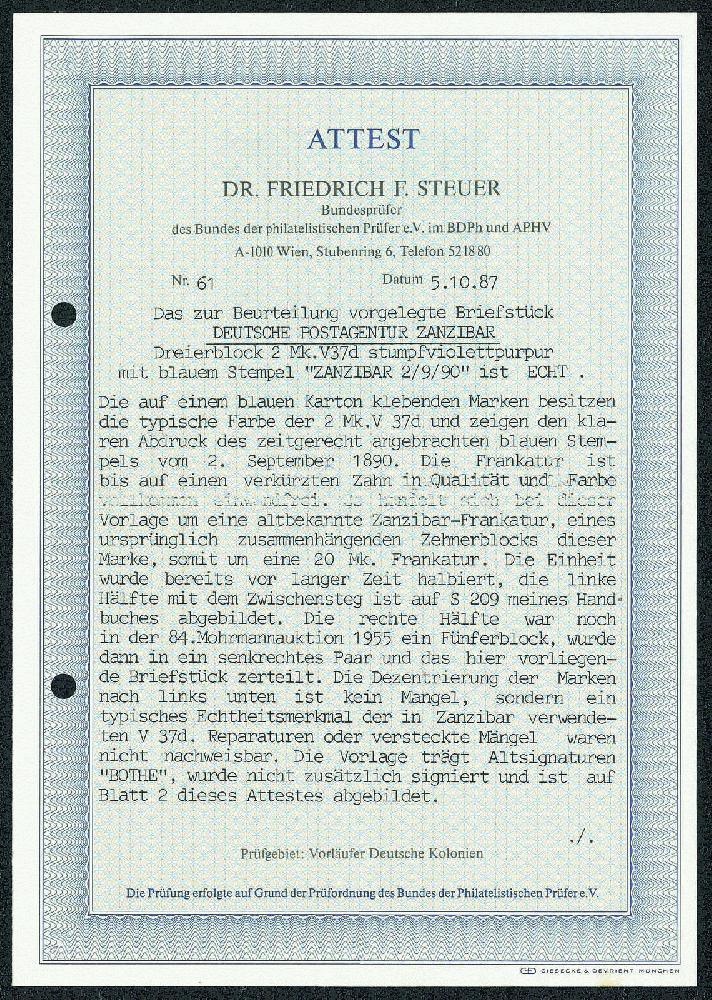 | Zusatzinformationen und Suchstichworte: | Gert Müller 114. Auktion Auktionstermin: 25. Mai 2022 Los 3056 Deutsche Kolonien Ostafrika, Vorläufer Sansibar DER DREIERBLOCK MIT BLAUEM STEMPEL: 2 Mk. lebhaftgraulila, ein wunderschöner Dreierblock, herrlich farbfrisch und bis auf eine winzige Zahnverkürzung perfekt gezähnt auf attraktivem blauem Karton-Ausschnitt mit besonders ausgeprägten, klaren, blauen K1 "ZANZIBAR KAISERL. DEUTSCHE POSTAGENTUR 2.9.90.". Bereits Einzelstücke dieser Ausgabe sind mit dem blauen Stempel extrem selten. Die hier angebotene Einheit zählt zu den ganz großen Raritäten von Deutsch-Ostafrika und stellt eine Zierde für die anspruchsvolle Spezialsammlung dar. Fotoatteste Dr. Friedrich Steuer BPP (1987) und Ronald Steuer (2021). Ausruf 7.500,00 EUR |