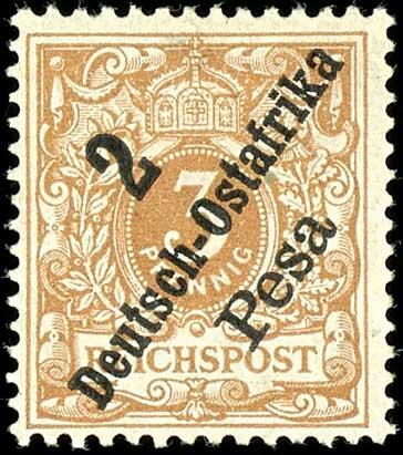 | Zusatzinformationen und Suchstichworte: | Dr. Reinhard Fischer 186. Auktion Auktionstermin: 18. - 21. Mai 2022 Los 2486 Deutsche Kolonien Ostafrika 2 Pesa auf 3 Pfennig Krone/Adler hellocker, tadellos ungebraucht mit Originalgummierung, Fotoattest Jäschke-Lantelme BPP (2008) "farbfrisch, gut gezähnt und in fehlerfreier, ungebrauchter Erhaltung.", Mi. 800.- Ausruf 240,00 EUR |