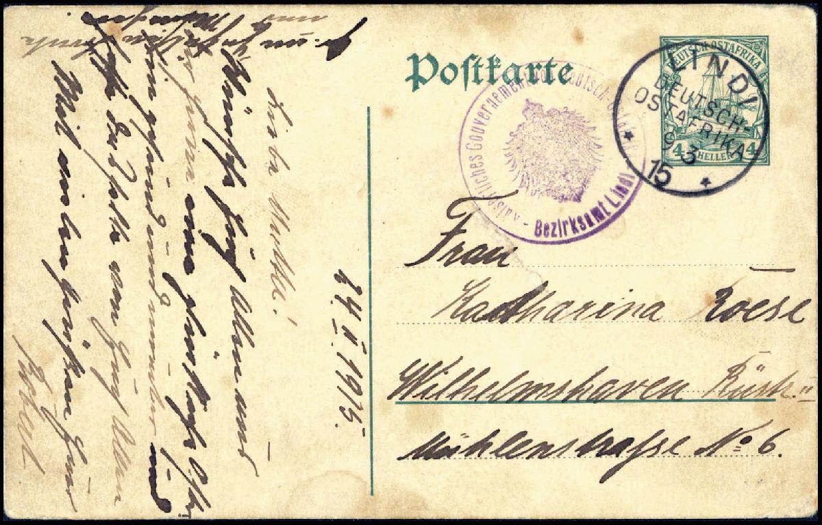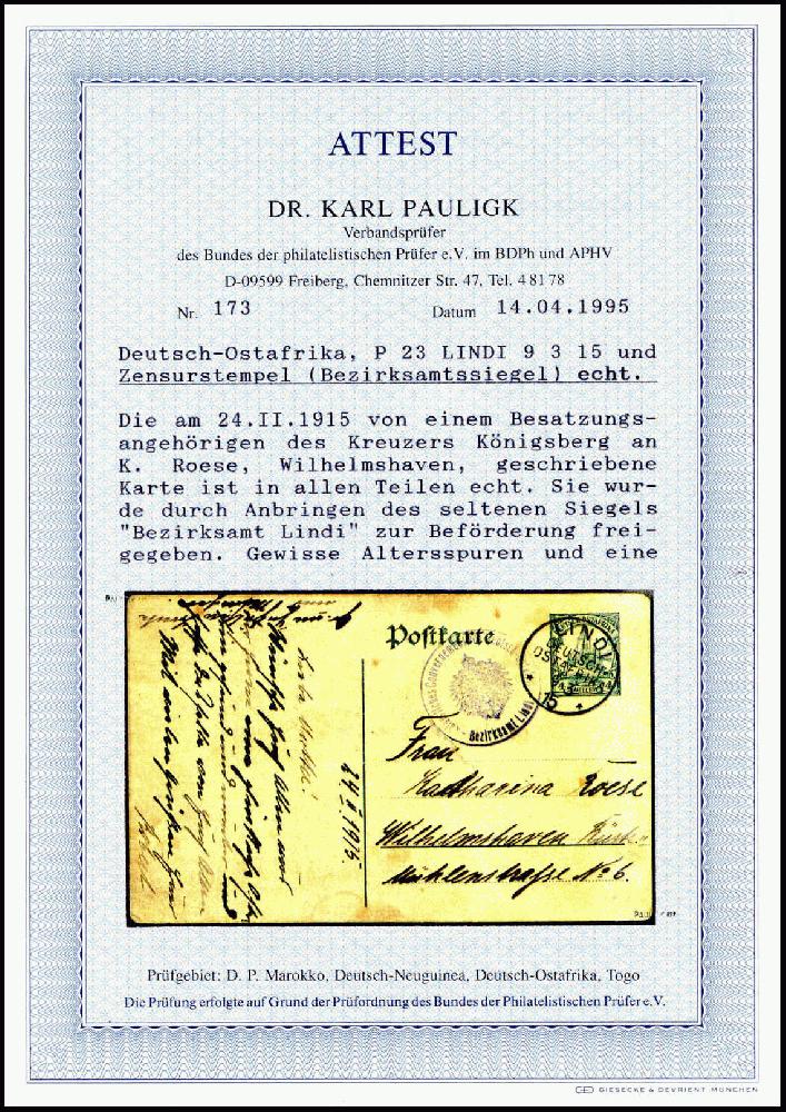 | Zusatzinformationen und Suchstichworte: | Württembergisches Auktionshaus - Spezialauktion "USAMBARA"-Sammlung Auktionstermin: 23. April 2022 Los 177 Deutsche Kolonien Deutsch Ostafrika Kreuzer Königsberg LINDI 9/3 15, klar auf Postkarte mit hs. Aufgabedatum "24.II.1915" (vorschriftsmäßig ohne Ortsangabe), geschrieben von dem "Königsberg"-Besatzungsmitglied K. Roese (Maschinenmaat) an seine Mutter nach Wilhelmshaven (Gebrauchsspuren). Beiges. klares Zensur-Dienstsiegel des Bezirksamts Lindi ohne hs. Zensurvermerk und rs. Eingangsvermerk vom 14.5.1915 (5. Postabgang ab Lindi). Eine seltene Karte aus der Blockadezeit des Kreuzers im Rufiji-Delta, Fotoattest Pauligk BPP. Zuschlag 820,00 EUR |