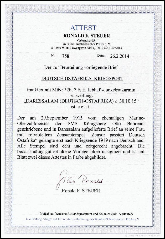 | Zusatzinformationen und Suchstichworte: | Württembergisches Auktionshaus 140. Versteigerung Auktionstermin: 18. Juni 2022 Los 6269 Deutsche Kolonien Deutsch Ostafrika Kreuzer Königsberg DARESSALAM 30/10 15, klar auf gef. Brief des Königsberg-Marine-Oberzahlmeisters Otto Behrendt an seine Frau nach Dtld., beiges. rotvioletter Zensurstempel der Postüberwachungsstelle Daressalam. Sehr selten, Fotoattest Steuer BPP. Ausruf 600,00 EUR |