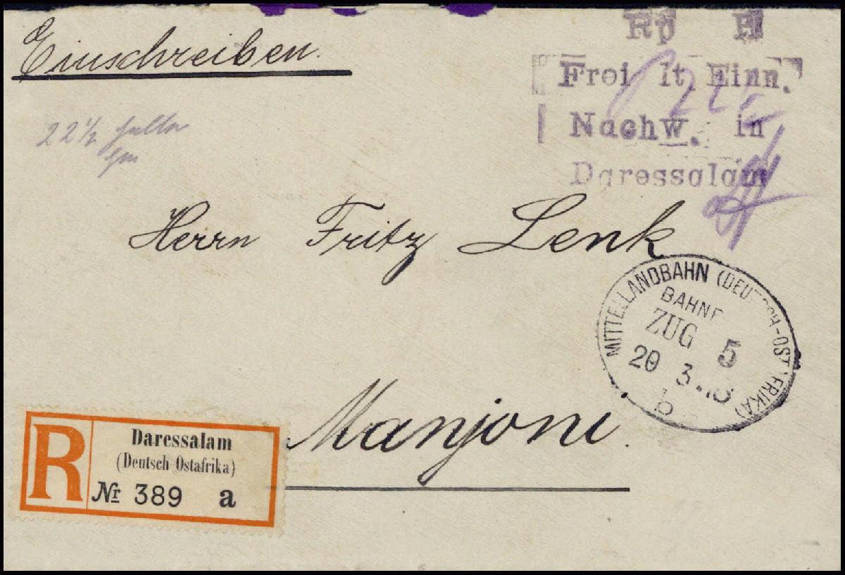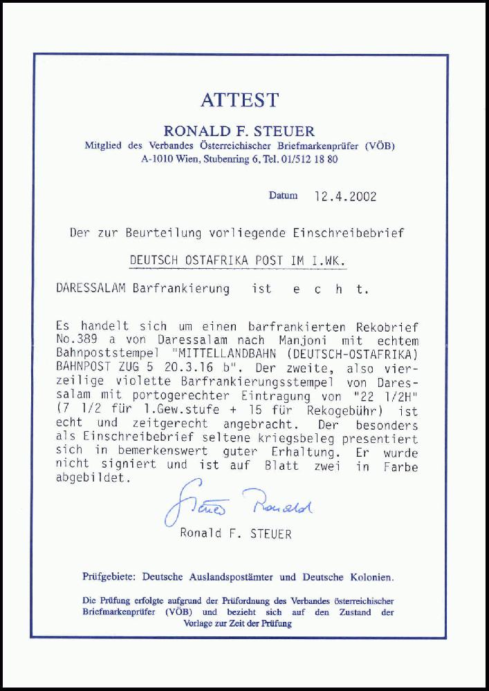 | Zusatzinformationen und Suchstichworte: | Württembergisches Auktionshaus - Spezialauktion "USAMBARA"-Sammlung Auktionstermin: 23. April 2022 Los 361 Deutsche Kolonien Deutsch Ostafrika Barfrankierungsstempel Vierzeiliger violetter Barfrankierungsstempel von Daressalam, ideal klar mit Portoeintrag "22½ H." auf sauberem Einschreibebrief mit Aufgabestempel MITTELLANDBAHN BAHNPOST ZUG 5 "b" 20/3 16 nach Manjoni (etwas unsauber geöffnet), Fotoattest Steuer BPP. Zuschlag 840,00 EUR |