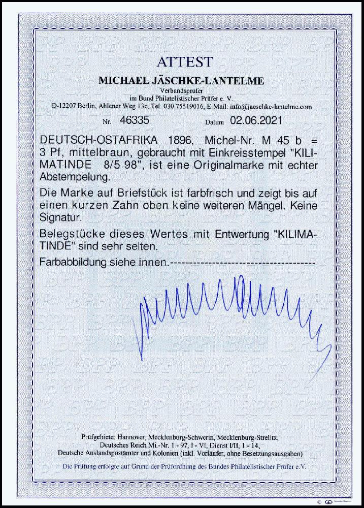 | Zusatzinformationen und Suchstichworte: | Württembergisches Auktionshaus 140. Versteigerung Auktionstermin: 18. Juni 2022 Los 6165 Deutsche Kolonien Deutsch Ostafrika Mitläufer 3 Pfg., vorzüglich frisches Exemplar auf schönem weißem Briefstück (oben eine Zahnspitze winz. kürzer) mit vollständig abgeschlagenem Stempel KILIMATINDE 8/5 98. Eine der großen Vor- bzw. Mitläufer-Seltenheiten. Mit dem Kilimatinde-Stempel sind sämtliche Wertstufen von 5-50 Pfg. im Handbuch Dr.Steuer lediglich mit "-,-" aufgeführt, Fotoattest Jäschke-L.BPP ("... sehr selten"). Ausruf 400,00 EUR |