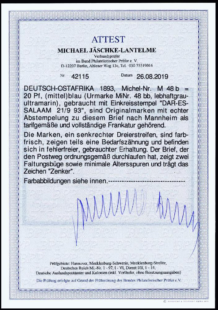 | Zusatzinformationen und Suchstichworte: | Württembergisches Auktionshaus 140. Versteigerung Auktionstermin: 18. Juni 2022 Los 6168 + Deutsche Kolonien Deutsch Ostafrika Mitläufer 20 Pfg. lebhaftgrauultramarin (Urmarke Mi.48bb), besonders farbfrischer, senkr. Dreierstreifen mit klaren Stempeln DAR-ES-SALAAM 21/9 93 auf Leinenkuvert nach Mannheim (leichte Beförd.-Spuren). Die Mi.48bb in Deutsch-Ostafrika verwendet stellt eine bemerkenswerte Seltenheit dar, Atteste Zenker, Jäschke-L.BPP. Ausruf 300,00 EUR |