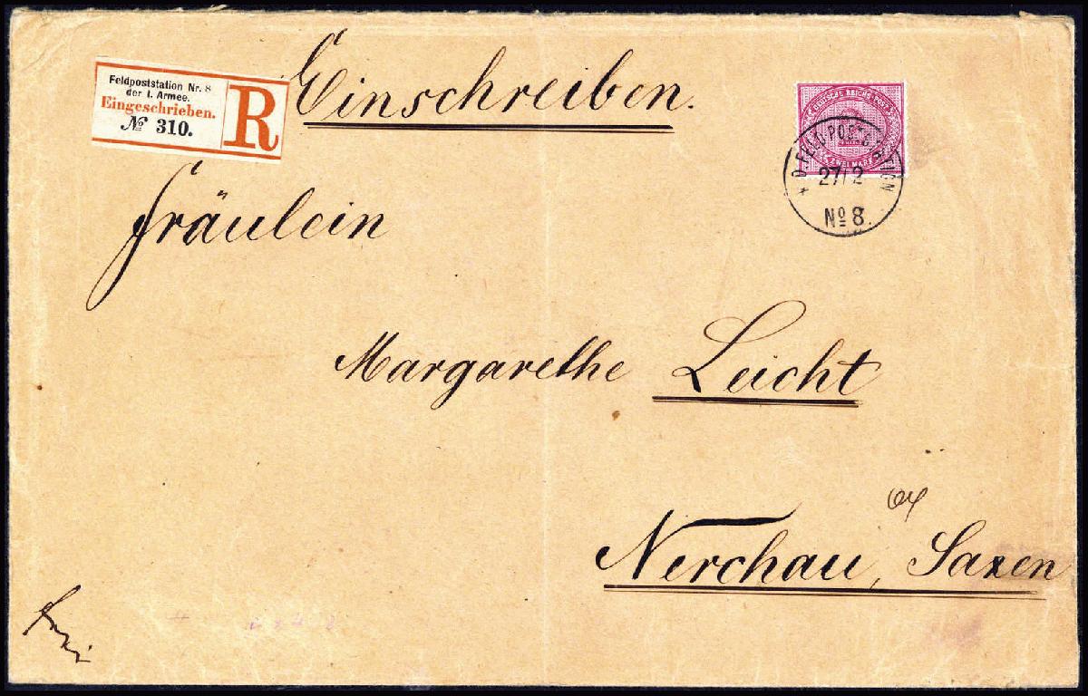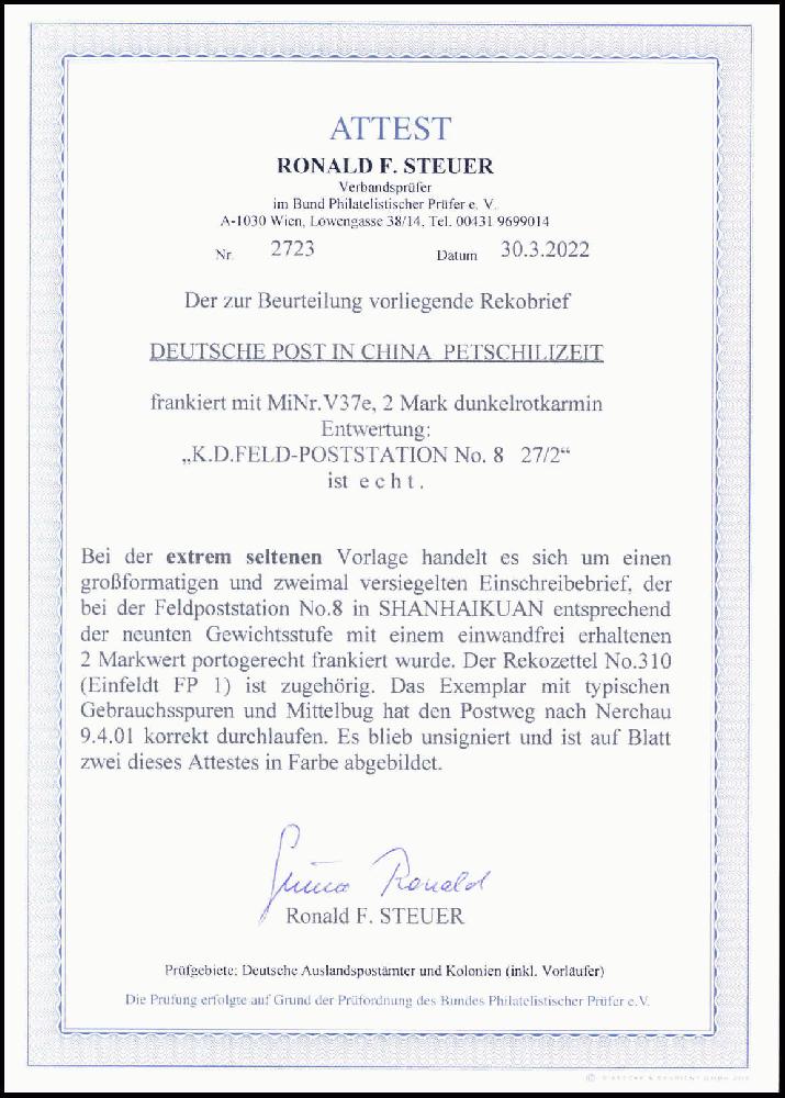 | Zusatzinformationen und Suchstichworte: | Württembergisches Auktionshaus 140. Versteigerung Auktionstermin: 18. Juni 2022 Los 5147 Deutsche Auslandspost China, Vorläufer 2 Mk., tadelloses, erstklassig farbfrisches Exemplar mit ideal aufges. Stempel K.D.FELD-POSTSTATION No.8 27/2 (1901) als tarifmäßige Einzelfrankatur auf Einschreibebrief in der 9. Gewichtsstufe nach Dtld. (übliche, leichte Beförd.-Spuren). R-Zettel "Feldpoststation Nr.8 der I.Armee". Eine außerordentlich seltene Petschili-Verwendung der 2 Mk. bei der Feldpoststation 8 in Shanhaikuan und eine der ganz wenigen bedarfsmäßigen Einzelfrankaturen der 2-Mk.-Marke bei der Dt.Post China, wie sie im Handbuch Dr.Steuer mit "LP" bewertet ist. Ein Spitzenstück der Deutschen China-Philatelie, Fotoattest Steuer BPP. Ausruf 5.000,00 EUR https://www.philasearch.com/de/i_9228_156872/149_Deutsche_Auslandspost_China_Vorlaeufer/9228-A140-5147.html?set_sprache=de&treeparent=COSUBGRP-10040%2CCO-149&postype=PH&page=3&row_nr=54&breadcrumbId=1655558185.5517 |