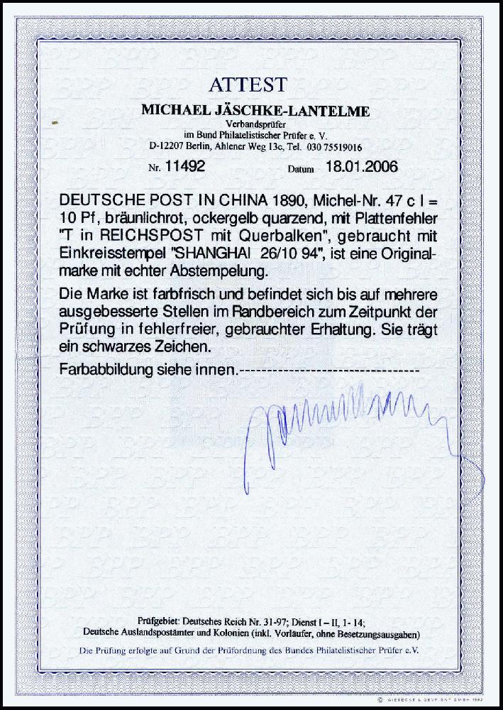 | Prüfgebiet: | Deutsche Auslandspostämter China |