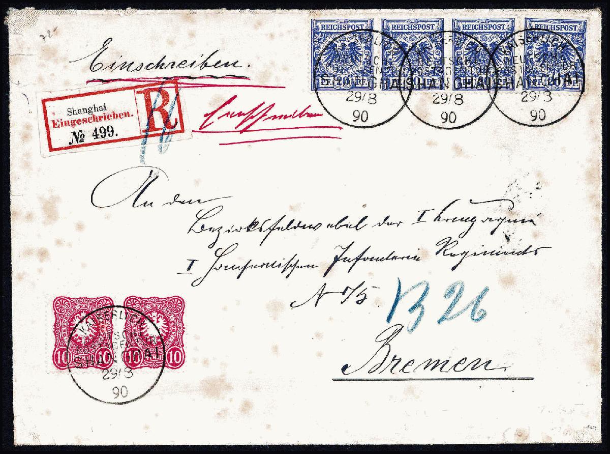 | Zusatzinformationen und Suchstichworte: | Württembergisches Auktionshaus 140. Versteigerung Auktionstermin: 18. Juni 2022 Los 5165 Deutsche Auslandspost China, VorläuferMischfrankatur Pfennig- mit Krone-/Adler-Ausgabe: 10 Pfg., tadelloses, waagr. Paar in Mischfrankatur mit Ausgabe Krone/Adler, waagr. Dreierstreifen und Einzelstück 20 Pfg. ultramarin auf Einschreibebrief nach Bremen (etwas stockfleckig), klar und sauber aufges. Stempel KDPA SHANGHAI 29/8 90. Eine in dieser Form einmalige Frankatur-Kombination für einen R-Brief in der 4.Gewichtsstufe, sign. Ebel, Fotoattest Jäschke-L.BPP Ausruf 1.300,00 EUR |
