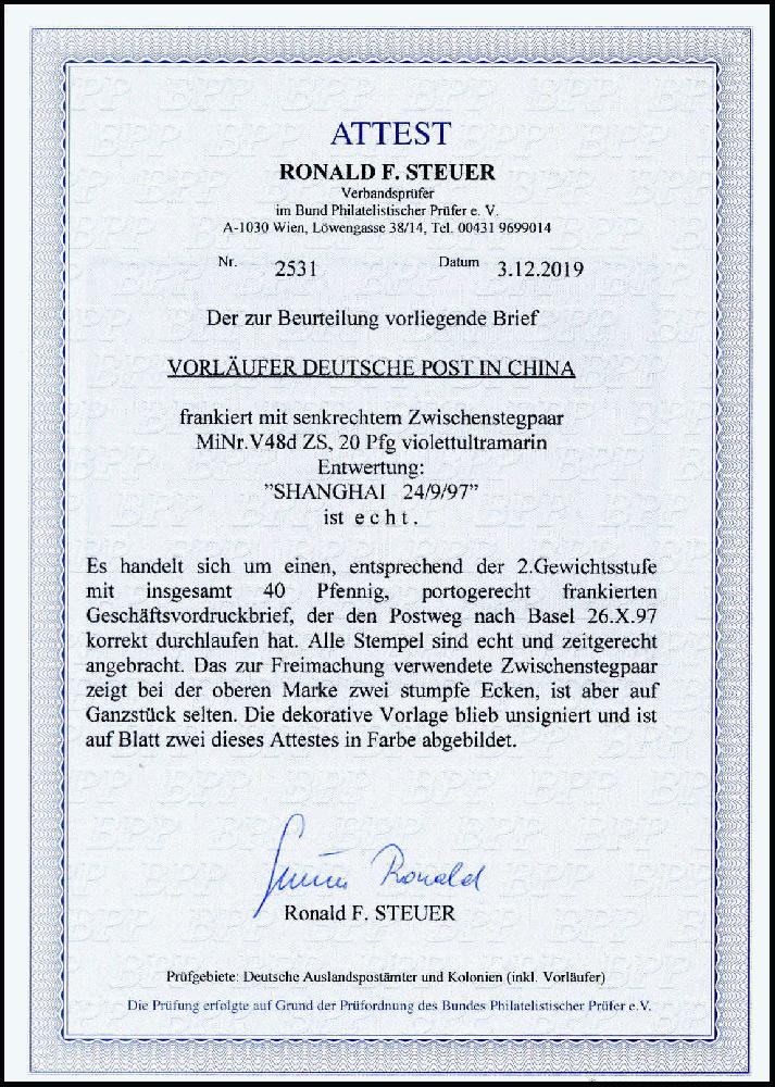 | Zusatzinformationen und Suchstichworte: | Württembergisches Auktionshaus 140. Versteigerung Auktionstermin: 18. Juni 2022 Los 5199 Deutsche Auslandspost China, Vorläufer 20 Pfg., vorzüglich farbfrisches, senkr. Zwischenstegpaar (obere Marke Zhg. etwas stumpf) auf schönem, weißem Vordruckbrief nach Basel, sauber aufges. Stempel SHANGHAI 24/9 97 und beiges. französ. Seepoststempel. Schon die Aufdruck-Ausgaben sind als Zwischenstegpaare auf Brief äußerst selten, die Vorläufermarken jedoch sind in dieser Form nahezu unauffindbar, Fotoattest Steuer BPP. Ausruf 350,00 EUR |