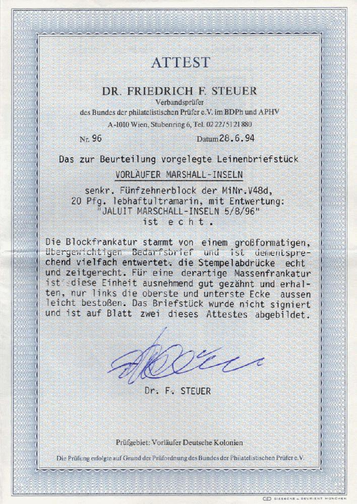 | Zusatzinformationen und Suchstichworte: | 73. AAK Phila GmbH Auktion Auktionstermin: 7. Mai 2022 Los 4472 (D) Deutsche Kolonien Marshall Inseln, Vorläufer 20 Pf violettultramarin im senkr. 15er-Bl. a. Leinen-Briefstück m. 2 Attesten Steuer VÖB bzw. BPP "echt, für derartige Massenfrankatur ausnehmend gut gezähnt u. erhalten...", imposantes Schaustück f.d. große Slg.! Eine der größten bekannten Einheiten! Katalogpreis: 1950++,- EUR Zuschlag 500,00 EUR |