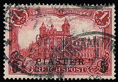 | Zusatzinformationen und Suchstichworte: | Rauhut & Kruschel - 212. Auktion Auktionstermin: 30. Juli 2022 Los 3278 Deutsche Auslandspost Türkei, Vorläufer 5 Pia. a. 1 Mk., mit Plattenfehler "Blitz" (Feld 14) gestempelt, ganz leichte Verfärbung wie bei dieser eosinkarminroten Druckfarbe häufig und ohne Bedeutung, eine seltene Marke, Attest Jäschke-L. Mi. 3000,- Ausruf 600,00 EUR |
