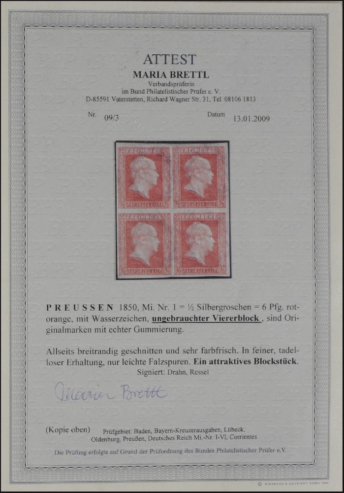 | Zusatzinformationen und Suchstichworte: | ungebrauchter Viererblock der Originalmarken mit Gummierung, seltene Einheit ex Sammlung Sanssouci (171. Dr. Reinhard Fischer Auktion) |