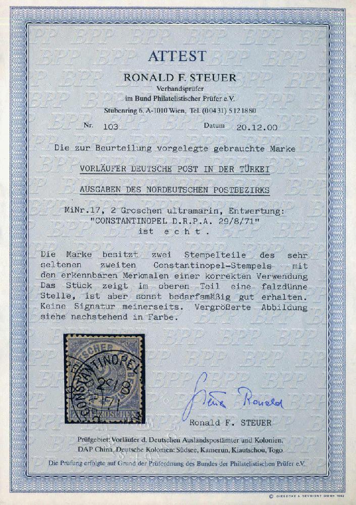 | Zusatzinformationen und Suchstichworte: | 73. AAK Phila GmbH Auktion Los 4343 (D) Deutsche Auslandspost Türkei, Vorläufer 2 Gr ultramarin m. sehr seltenem zweiten Constantinopel-Stpl. m. FA Steuer BPP "echt, sehr selten, zeigt im oberen Teil eine falzdünne Stelle, sonst gut erhalten", lt. Handbuch 3000.-!, selten angeboten! Ausruf 300,00 EUR https://www.philasearch.com/de/i_9101_252043/159_Deutsche_Auslandspost_Tuerkei_Vorlaeufer/3-A73-4343.html?set_sprache=de&treeparent=COSUBGRP-10040%2CCO-159&postype=PH&indexTableId=0&breadcrumbId=1655618697.3512&row_nr=22 |