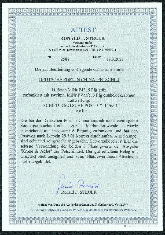| Zusatzinformationen und Suchstichworte: | Gert Müller 114. Auktion Auktionstermin: 25. Mai 2022 Los 3023 Deutsche Auslandspost China, Petschili Ausgaben PETSCHILI-VERWENDUNG AUF JAHRHUNDERT-GANZSACHE: 3 Pfg. dunkelockerbraun, die seltene Farbe, zwei farbfrische Luxusstücke als Zusatzfrankatur auf Jahrhundert-Ganzsache 5 Pfg. Germania-Reichspost mit klarem K1 "TSCHIFU DEUTSCHE POST 15.6.01." nach Leipzig mit Ankunftsstempel. Bereits lose gest. ist diese Farbe sehr selten, auf Brief im Michel-Spezialkatalog lediglich ohne Preis notiert. In dieser Verwendung und Schönheit eine Rarität der Petschili-Ausgaben! Fotoattest Steuer BPP. Zuschlag 3.200,00 EUR |