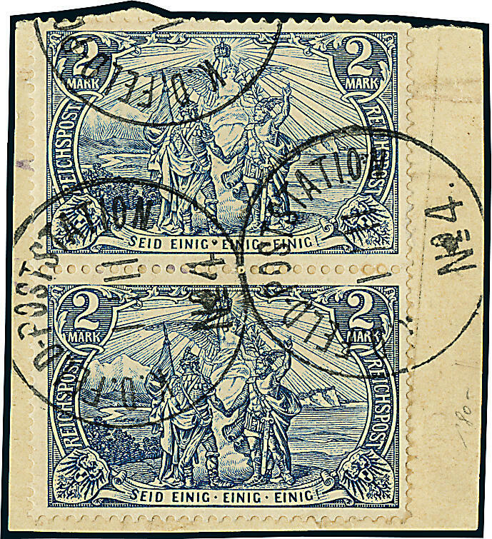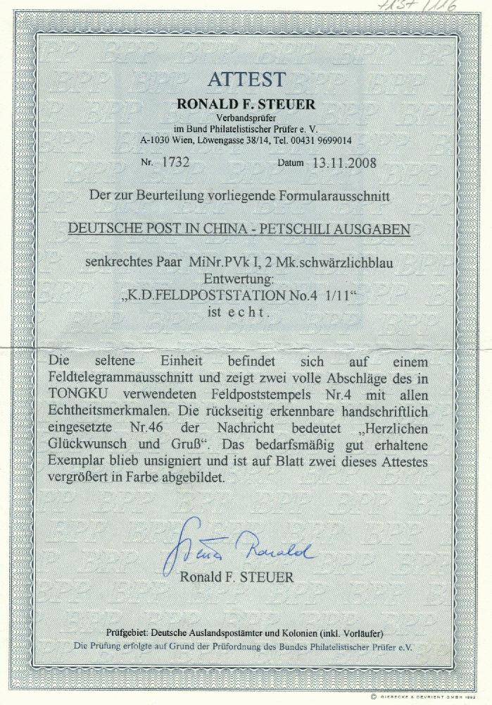 | Zusatzinformationen und Suchstichworte: | Dr. Derichs 165. Auktion Auktionstermin: 10. - 11. Juni 2022 Los 3861 Deutsche Auslandspost China, Petschili Ausgaben Petschili 2 Mk. "Reichspost", Type "I", senkrechtes Paar auf Feldtelegramm-Ausschnitt mit K1 "K.D. Feldpoststation No.4., 1/11" (verwendet in Tongku). Kabinett. Die rückseitig erkennbare handschriftlich eingesetzte Nummer "46" der Nachricht bedeutet "Herzlichen Glückwunsch und Gruß". Fotoattest Steuer BPP. (Michel 1.700.-+, das ist der Preis für zwei lose Marken ohne Aufschlag für die Einheit und für die Verwendung auf Formularausschnitt.). Ausruf 400,00 EUR |