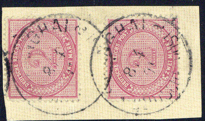 | Zusatzinformationen und Suchstichworte: | 117. Veuskens Auktion Auktionstermin: 1. - 2. Juli 2022 Los 1998 Deutsche Auslandspost China Petschili-Feldpost: 2 Mark Innendienst, zwei Marken in f.-Farbe (rötlichkarmin) auf Briefstück, gebraucht während der Boxerunruhen, mit zwei echten Stpln. 'Shanghai a 8/4 01'. Die untere Marke zusätzl. mit Abart V. 'Unterberechnung in der Guilloche unten links'. Mit ausführl. Farbfotobefund Jäschke-Lantelme BPP 'echt und einwandfre, befinden sich in fehlerfreier Erhaltung, nicht repariert. Keine Signatur'. Ausruf 150,00 EUR |