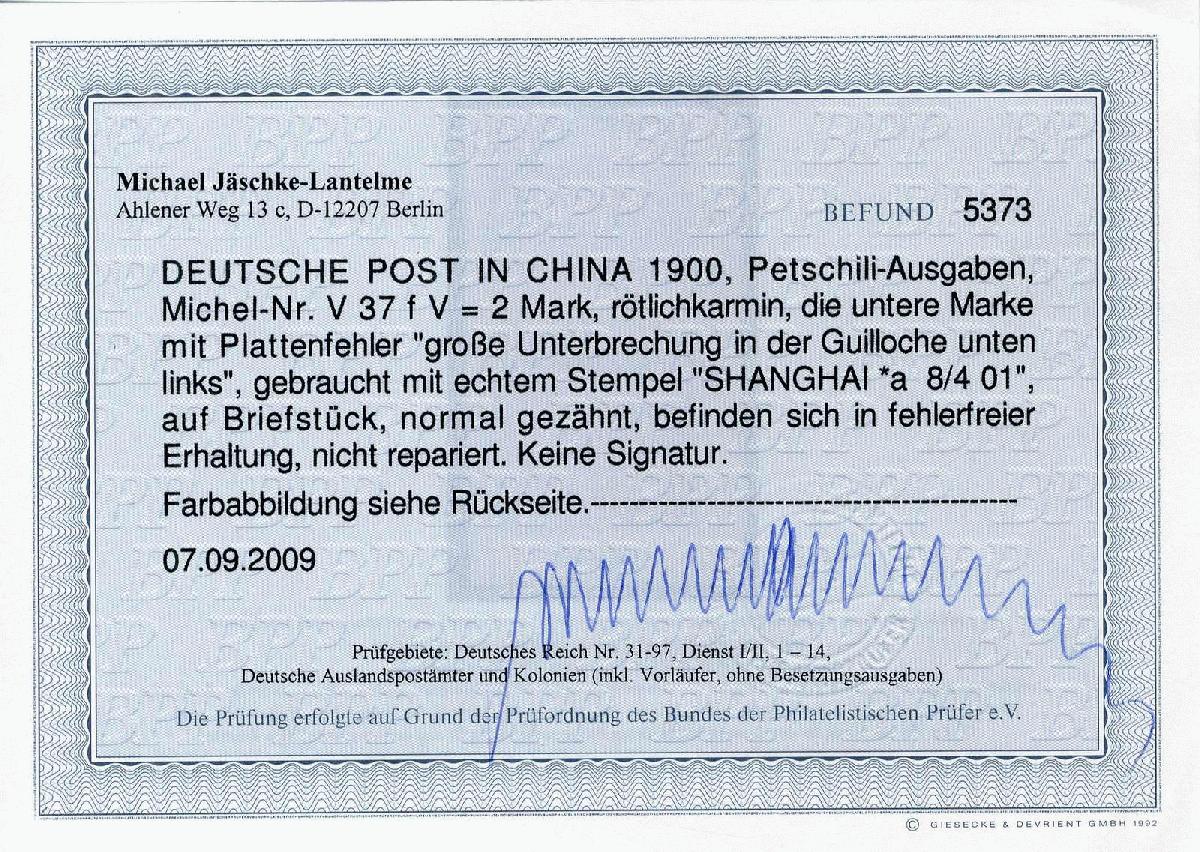 | Prüfgebiet: | Deutsche Auslandspostämter China Petschili-Ausgaben |