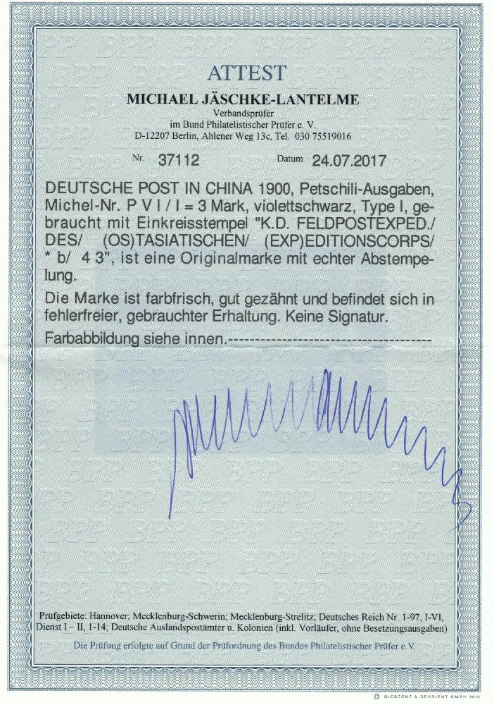 | Prüfgebiet: | Deutsche Auslandspostämter China Petschili-Ausgaben |