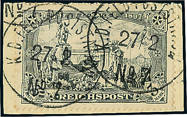 | Zusatzinformationen und Suchstichworte: | Dr. Derichs 165. Auktion Auktionstermin: 10. - 11. Juni 2022 Los 3864 Deutsche Auslandspost China, Petschili AusgabenPetschili 3 Mk. "Reichspost", gute Type "II", auf Feldtelegramm-Ausschnitt mit K1 "K.D. Feld-Poststation No.7, 27/2". Kabinett. Fotoattest Jäschke-Lantelme BPP: "in fehlerfreier, gebrauchter Erhaltung". (Michel 950.-+, das ist der Preis für eine lose Marke. Die Verwendung auf einem Formularausschnitt erfordert einen Aufschlag.). Ausruf 300,00 EUR |