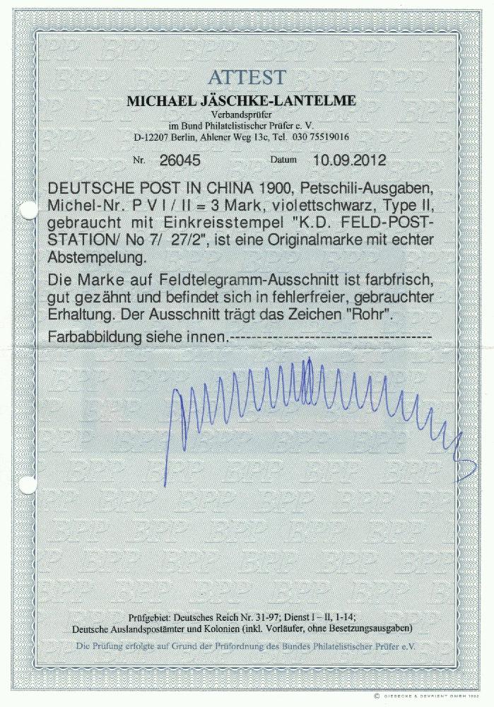 | Prüfgebiet: | Deutsche Auslandspostämter China Petschili-Ausgaben |