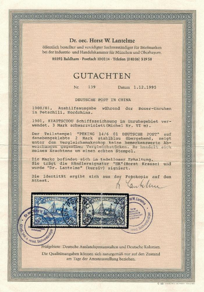 | Zusatzinformationen und Suchstichworte: | Dr. Derichs 165. Auktion Auktionstermin: 10. - 11. Juni 2022 Los 3867 Deutsche Auslandspost China, Petschili Ausgaben Petschili 3 Mk. "Kiautschou", Luxusstück mit Stempel "Peking Deutsche Post". Eine sehr seltene Marke. Signiert "HK" (= Horst Krause, Gelsenkirchen) und Fotogutachten Dr. Lantelme. (Michel 3.800.-). Ausruf 900,00 EUR |