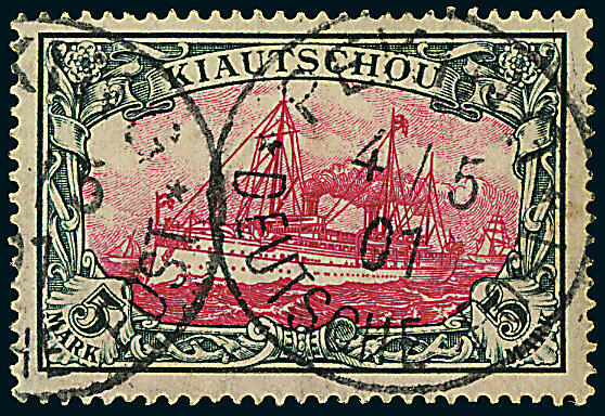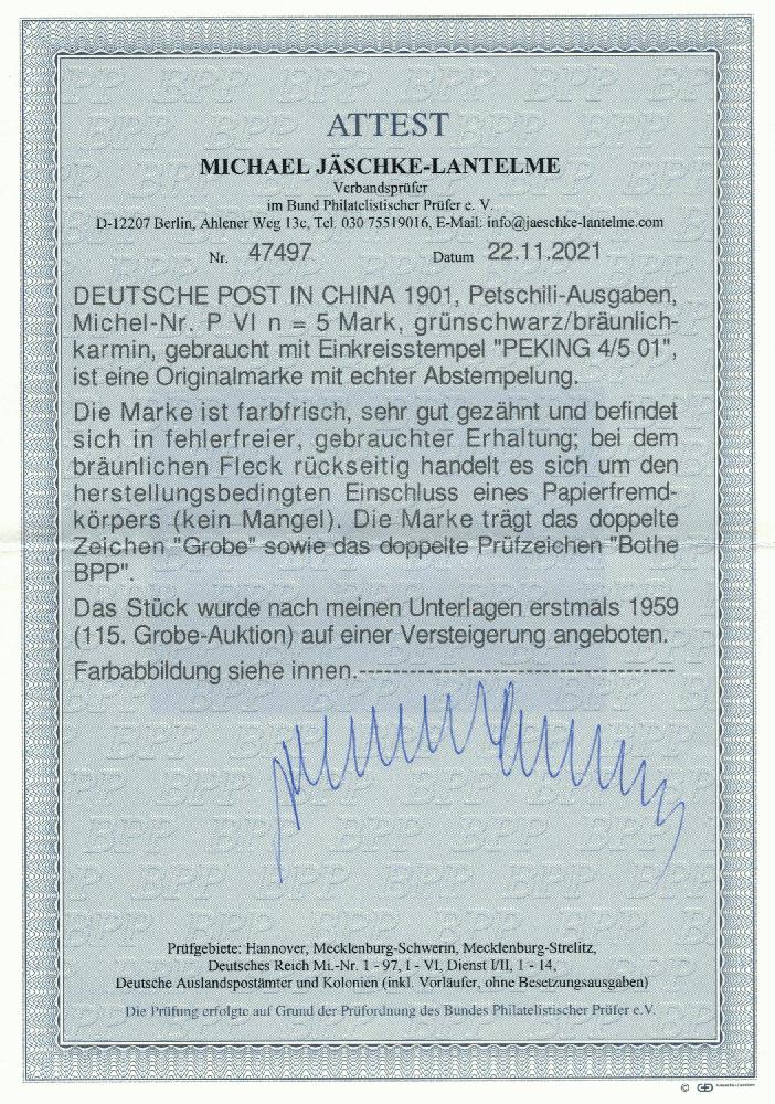 | Zusatzinformationen und Suchstichworte: | Dr. Derichs 165. Auktion Auktionstermin: 10. - 11. Juni 2022 Los 3868 Deutsche Auslandspost China, Petschili Ausgaben Petschili 5 Mk. "Kiautschou", Luxusstück mit besonders schöner Abstempelung "Peking Deutsche Post 4/5 01". Dies ist die mit Abstand seltenste und im Michel auch am höchsten bewertete Petschili-Marke. Fotoattest Bothe BPP und neues Fotoattest Jäschke-Lantelme BPP: "in fehlerfreier, gebrauchter Erhaltung". (Michel 7.500.-). Ausruf 3.000,00 EUR |
