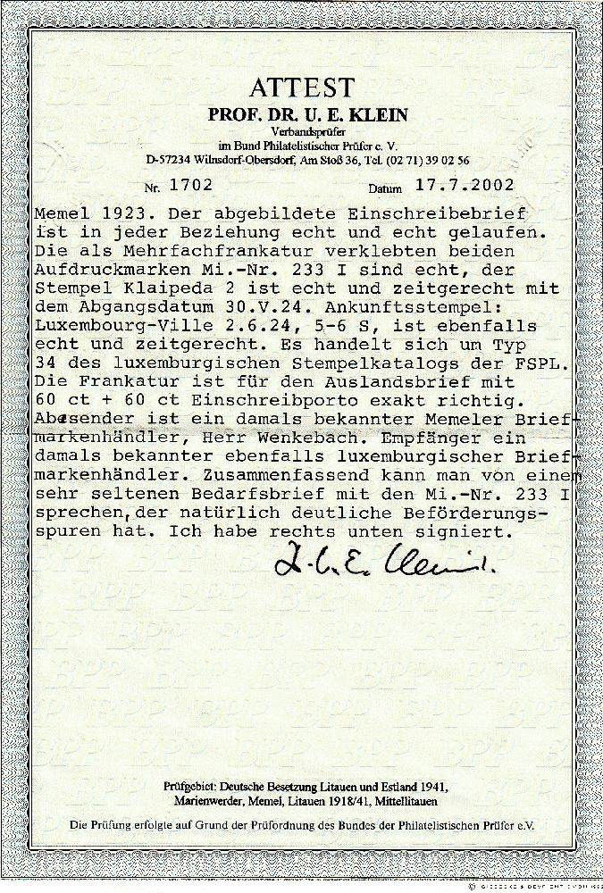 | Prüfer: | Klein, Udo E. (BPP (Bund Philatelistischer Prüfer)) |