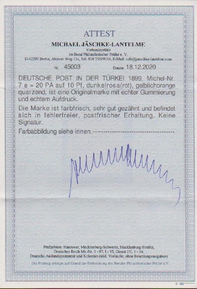 | Zusatzinformationen und Suchstichworte: | Rauhut & Kruschel - 212. Auktion Auktionstermin: 30. Juli 2022 Los 3273 Deutsche Auslandspost Türkei, Vorläufer 20 Para a. 10 Pfg. dunkelrosarot, UV gelblichorange, die seltenste Farbe tadellos postfrisch, Attest Jäschke-L. Mi. 1500,- Ausruf 450,00 EUR |