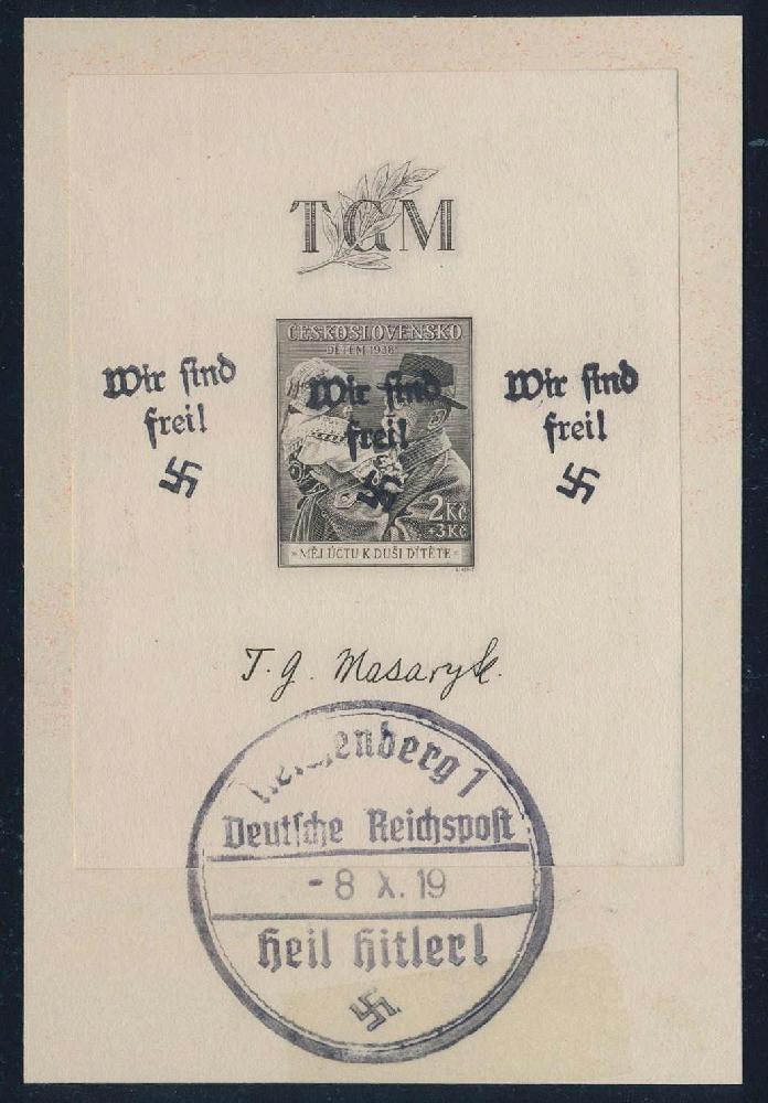 | Zusatzinformationen und Suchstichworte: | 79. HBA Auktion Auktionstermin: 12. - 14. Mai 2022 Los 1293 Sudetenland Reichenberg 1938, Masaryk mit Kind, Blockausgabe, 2+3 Kc., olivschwarz, neben dem Aufdruck auf der Marke zwei weitere Aufdrucke im Blockrand links und rechts der Marke, auf Kartenausschnitt, entwertet mit SST von Reichenberg, tadellose Kabinetterhaltung, der Block hat laut Dr. Hörr eine Gesamtauflage von nur 40 Exemplaren, ein weiterer Block mit drei Aufdrucken hat bisher nicht vorgelegen, gepr. Brunel mit neuem Fotoattest, der Normalblock wertet 6500,--, Herr Brunel hat für die Prüfung dieses Blocks einen Katalogwert von 10000,-- zugrunde gelegt. Zuschlag 4.300,00 EUR |