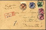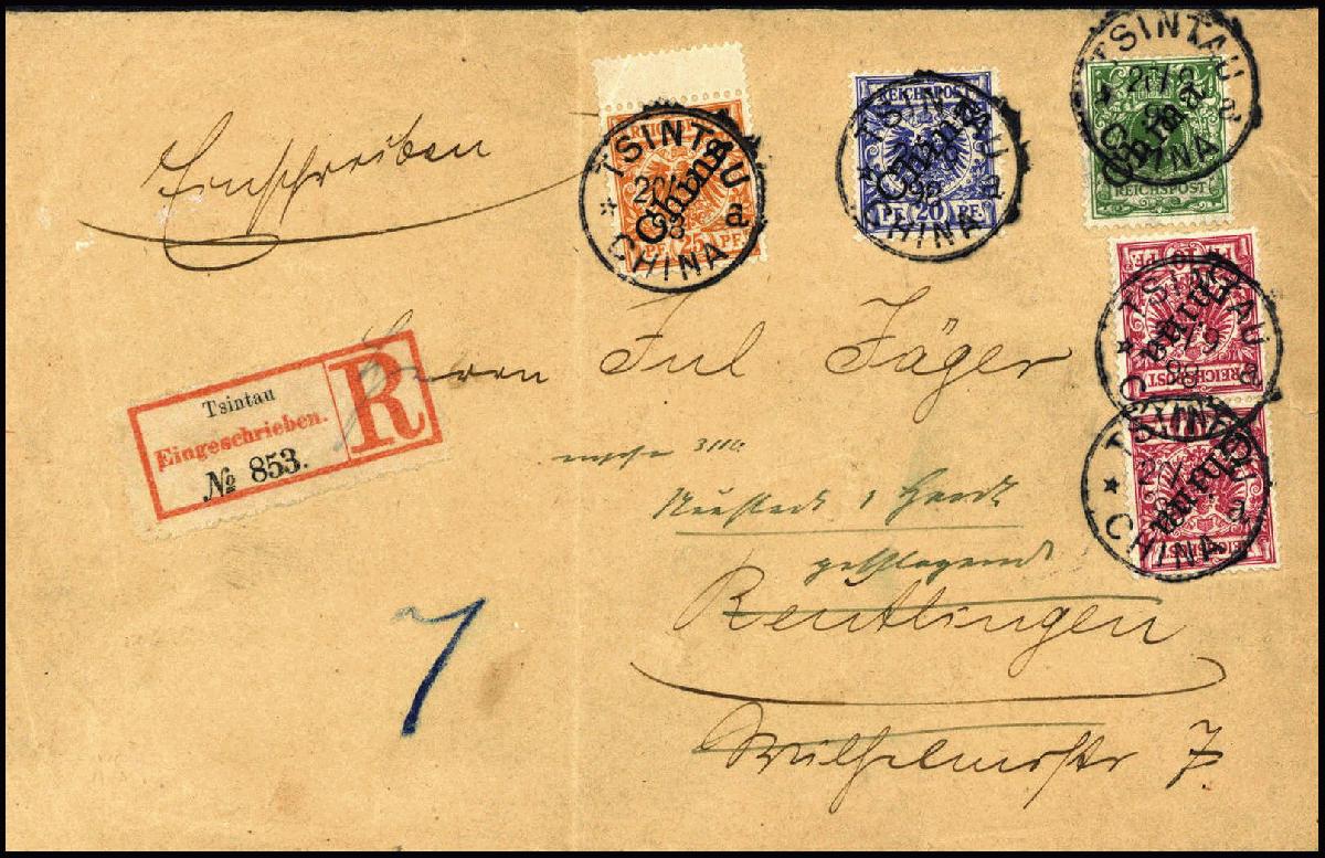 | Zusatzinformationen und Suchstichworte: | Württembergisches Auktionshaus 140. Versteigerung Auktionstermin: 18. Juni 2022 Los 7359 Deutsche Kolonien Kiautschou, Vorläufer 5 Pfg. zusammen mit senkr. Paar 10 Pfg. sowie 20 und 25 Pfg. (diese oben mit Zwischensteg), tadellose 70-Pfg.-Frankatur auf gef. Einschreibebrief nach Reutlingen, jede Marke mit klarem Stempel TSINTAU CHINA "a" 20/9 98 entwertet. Eine außergewöhnlich Vorläufer-Rarität, wobei lt. Fotoattest Dr.Steuer BPP ledigl. nur noch ein weiterer Einschreibebrief mit dieser Abstempelung registriert ist (1992). Der Stempel wertet im Handbuch Dr.Steuer auf der V2I mit Faktor 30, auf den übrigen Marken mit Faktor 5 bis 10. Ausruf 1.500,00 EUR https://www.philasearch.com/de/i_9228_159082/204_Deutsche_Kolonien_Kiautschou_Vorlaeufer/9228-A140-7359.html?set_sprache=de&treeparent=COSUBGRP-10040%2CCO-204&postype=PH&breadcrumbId=1655643182.6258&row_nr=10 |