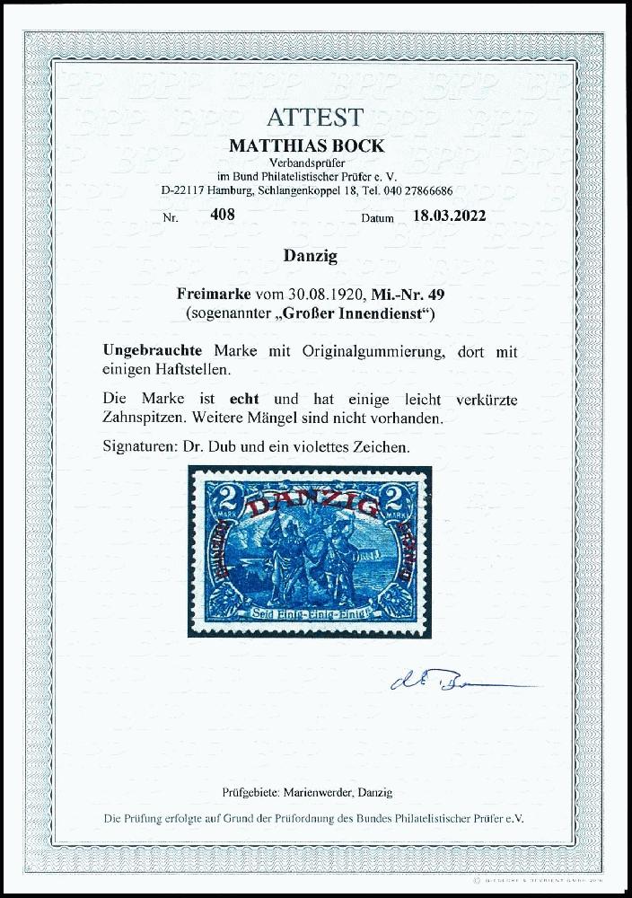 | Zusatzinformationen und Suchstichworte: | Dr. Reinhard Fischer 186. Auktion Auktionstermin: 18. - 21. Mai 2022 Los 2861 Danzig 2 Mark "Großer Innendienst", ungebraucht mit Originalgummierung, einige leicht verkürzte Zahnspitzen, Auflage nur 2.280 Exemplare, Fotoattest Bock BPP (2022), Mi. 1.400.- Zuschlag 360,00 EUR |