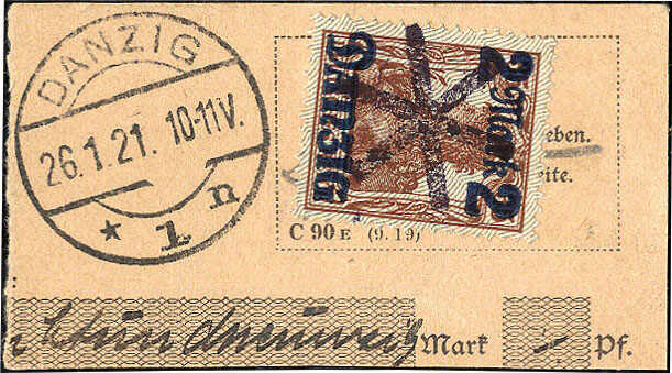| Zusatzinformationen und Suchstichworte: | Götz 398. Auktion Auktionstermin: 22. - 23. Juni 2022 Los 3319 Danzig 2 Mk. a. 35 Pfg. Germania in seltener Type II (Spitze nach unten) auf Postanweisungsabschnitt, sauber entwertet mit für Postanweisungen übliche Entwertung eines Sicherungsstempels, sowie nebengesetztem Aufgabestempel "Danzig 26.1.21". Farbfotoattest Dr. Oechsner: "echt u. einwandfrei". Mi. 700,- EUR Ausruf 120,00 EUR |