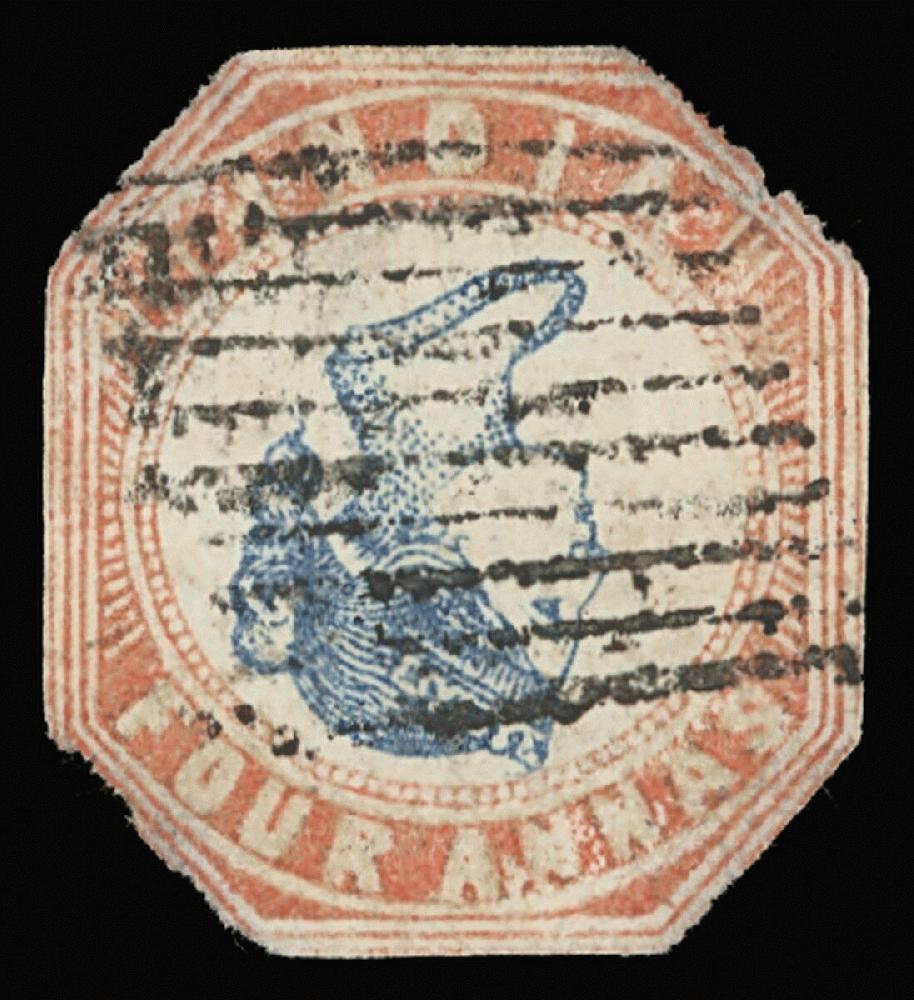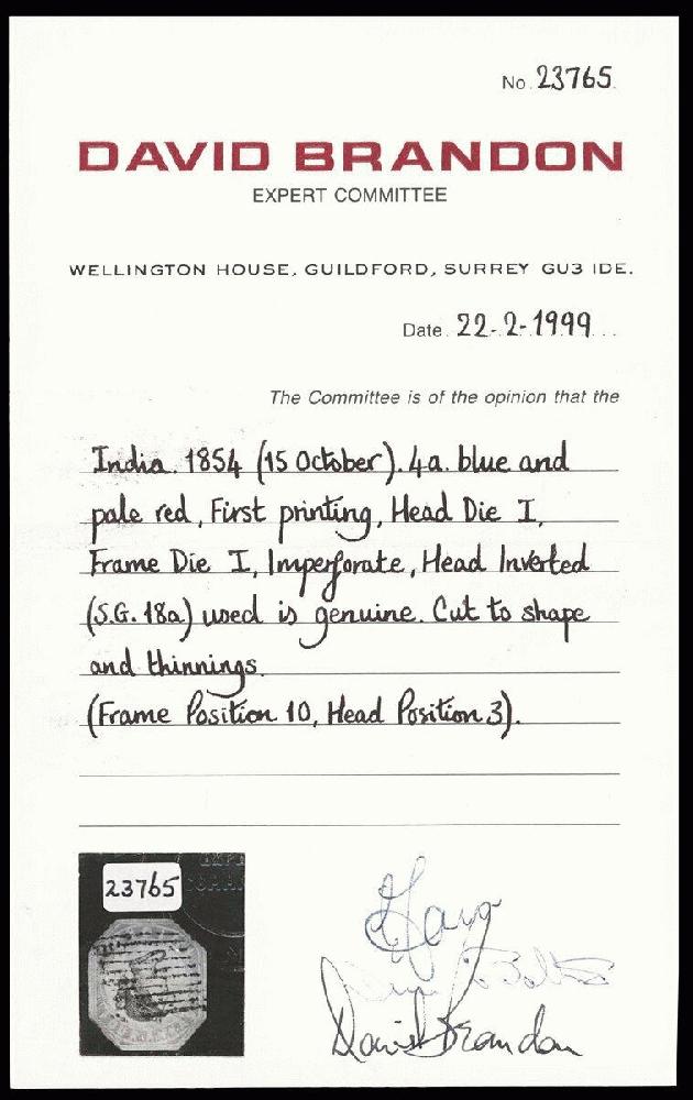 | Zusatzinformationen und Suchstichworte: | Spink 22019 - The 'M' Collection of India and Indian Feudatory States Auktionstermin: 23. Juni 2022 Los 1051 (x) Indien Indien. 1854 Ausgabe vier Annas. Erstauflage, Kopf Die I, Rahmen Die I. Der berühmte kopfstehend Kopf Abart. 4 a. rot und blau, Erstauflage, Kopf Die I, Rahmen Die I, Abart Kopf kopfstehend, Kopf [3], Rahmen [10], kräftige Farben und Abdrucke, cut-to-shape, als nahezu dies alles berühmtes Abart sind, verlassen Rahmenlinien stellenweise, sauber gestempelt mit Diamant von Barren; ein paar helle Stellen nicht berührt scheinend. Eine hervorragende Gelegenheit zum Erwerb eine der meistgefragter Briefmarken in 19. Jahrhundert Philatelie und ein der legendären philatelistisch Raritäten in der Welt. Nicht verzeichnet in "Encyclopaedia von selten und berühmtes Briefmarken" Band I. Brandon Attest (1999). S. G. 18 a. Foto (Schätzpreis £60000 - £80000) Ausruf 150,00 GBP |