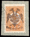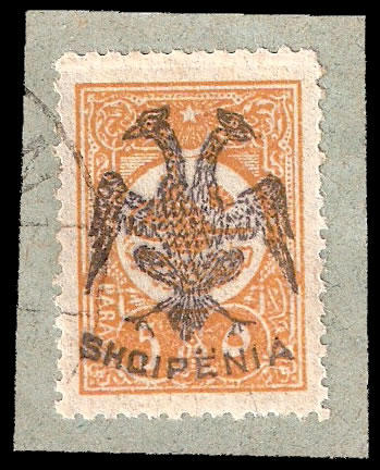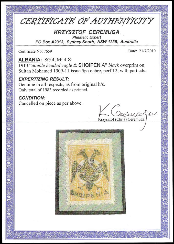 | Zusatzinformationen und Suchstichworte: | Filat AG Shop Neu Los 1194 (D) Albanien 1913 Double-Headed Eagle & SHQIPENIA ovpt in black on Sultan Mohamed 1909-11 5pa ochre (SG 4, Mi 4). VF/U example tied to piece by part cds. Scarce stamp, fascinating issue. Photo-cert: Ceremuga. (cv£425) Festpreis 495,00 CHF |