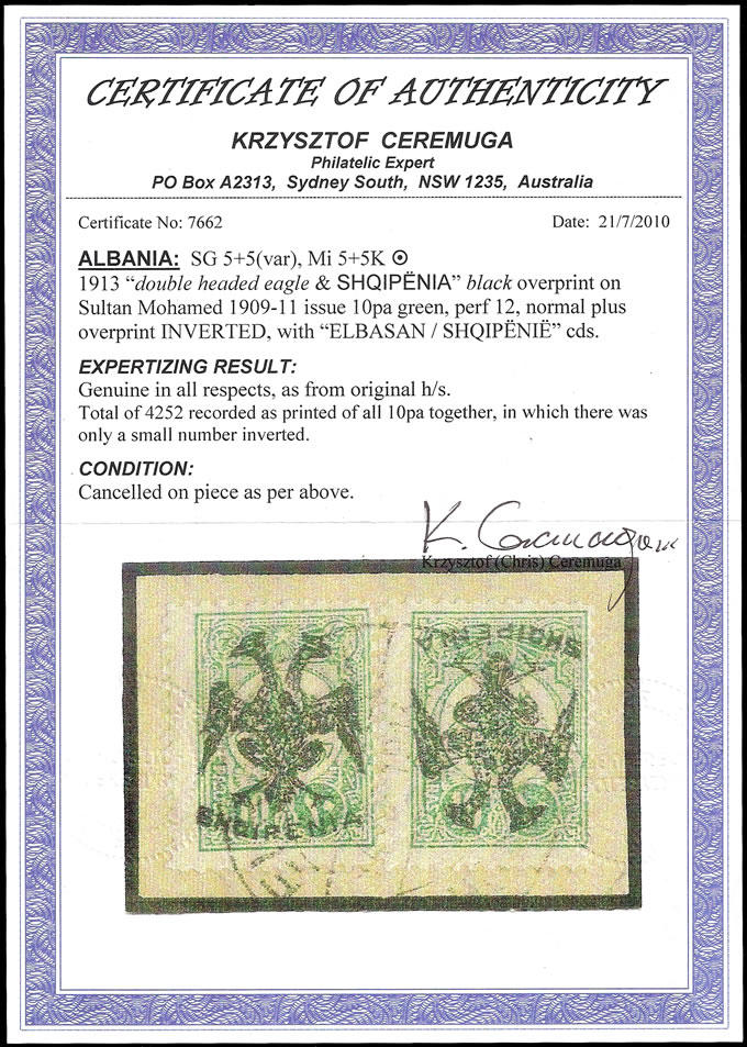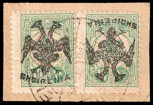 | Zusatzinformationen und Suchstichworte: | Filat AG Shop Neu Los 1195 (D) Albanien 1913 Double-Headed Eagle & SHQIPENIA ovpt in black on Sultan Mohamed 1909-11 10pa green, one normal and one OVERPRINT INVERTED (SG 5 and 5var, Mi 5 and 5k). VF/U examples tied to piece by Elbasan Shqipenie cds. Scarce stamps, rare with the inverted overprint, fascinating issue. Photo-cert: Ceremuga. (cv£unlisted) Festpreis 875,00 CHF |