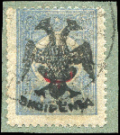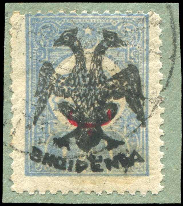 | Zusatzinformationen und Suchstichworte: | 30. Schlegel Auktionshaus Auktion Auktionstermin: 25. - 27. April 2022 Los 90 Albanien 1913, 1 Pia. blau mit Doppeladler-Aufdruck auf Türkeimarke mit Beyiye-Aufdruck, farbfrisch, üblich gezähnt und zentriert, rückseitig mehrfach signiert und Fotoattest Dr. Peters AIEP, eine seltene Marke (ME 1.700,-) Zuschlag 450,00 EUR |