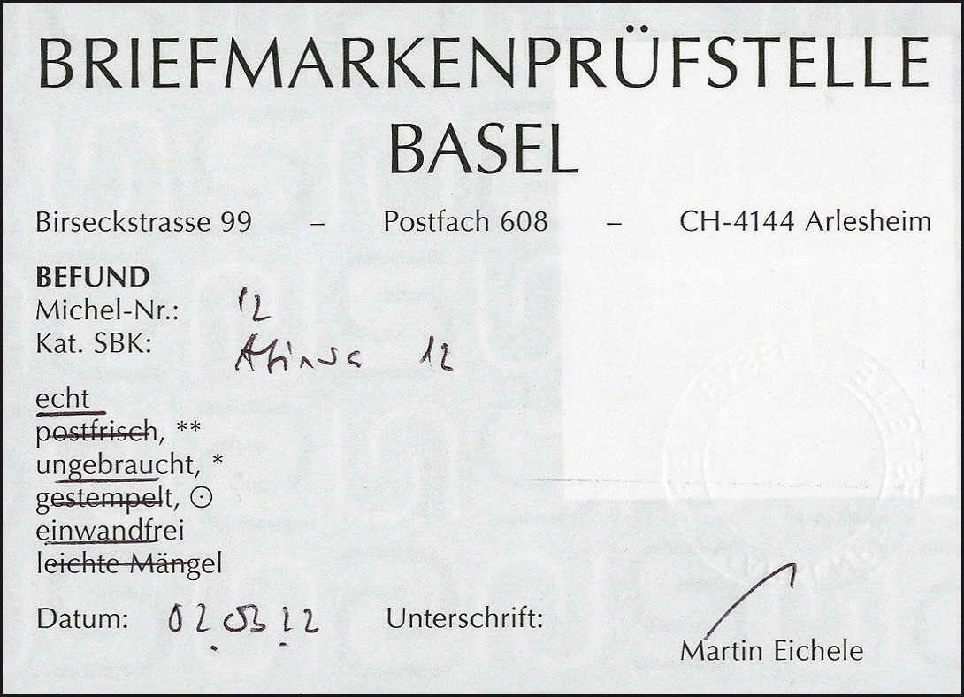 | Prüfer: | Eichele, Martin (BPB (Briefmarkenprüfstelle Basel)) |