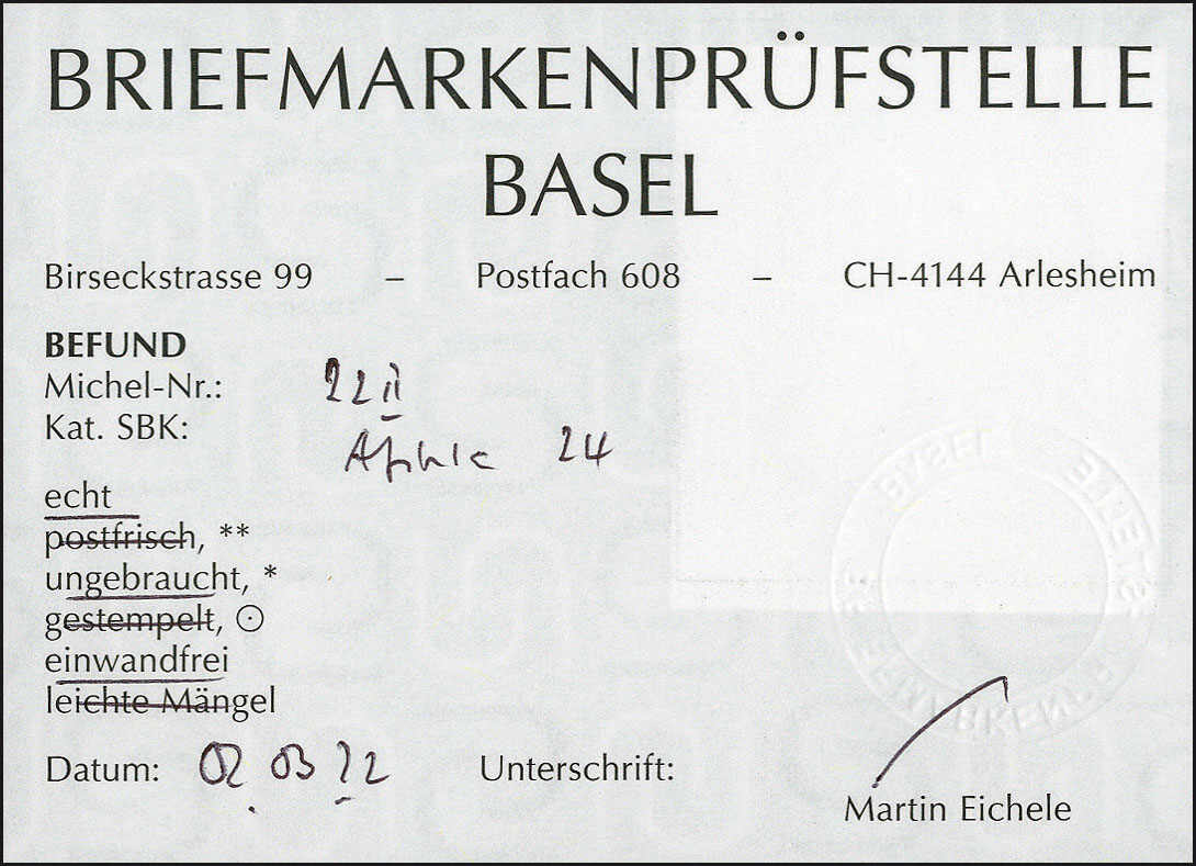 | Prüfer: | Eichele, Martin (BPB (Briefmarkenprüfstelle Basel)) |