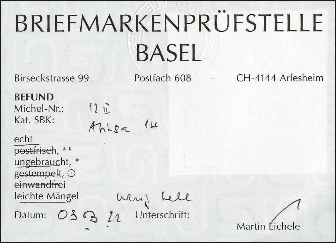 | Prüfer: | Eichele, Martin (BPB (Briefmarkenprüfstelle Basel)) |