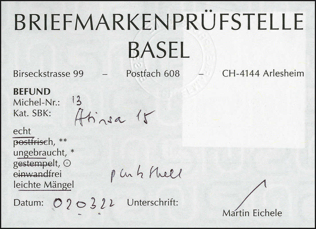 | Prüfer: | Eichele, Martin (BPB (Briefmarkenprüfstelle Basel)) |