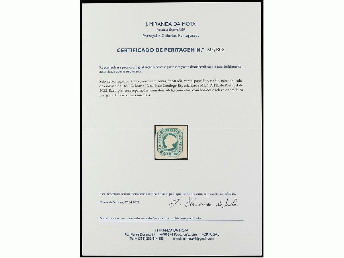 | Zusatzinformationen und Suchstichworte: | Soler y Llach - 777. Auktion - Stamps and Covers of the World Auktionstermin: 19. Juli 2022 Los 1247 Portugal PORTUGAL. 1853. 50 reis verde, sin goma. Amplios márgenes. Sello de excelente presencia pese a estar adelgazado (thinned). Cert. MIRANDA DA MOTA. Mu.3. Mundifil.4.900€. Ausruf 500,00 EUR |