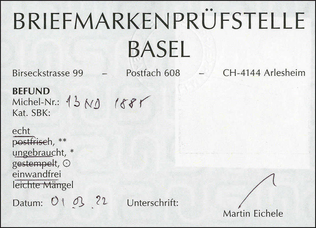 | Prüfer: | Eichele, Martin (BPB (Briefmarkenprüfstelle Basel)) |