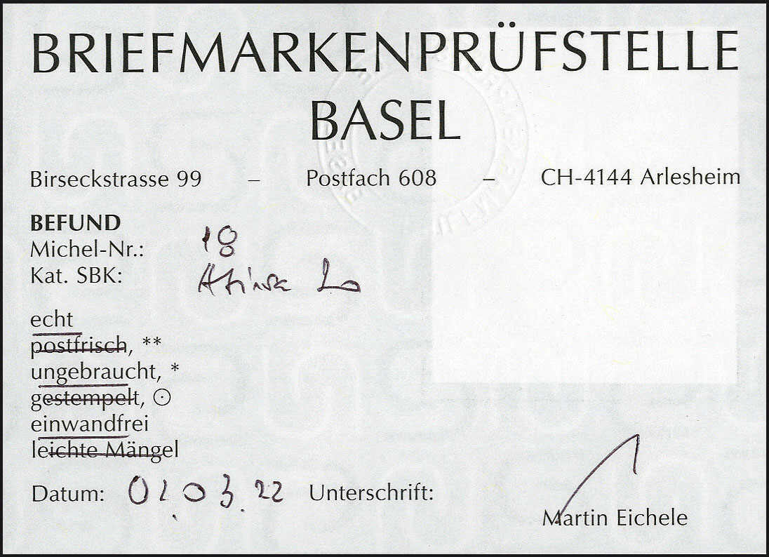 | Prüfer: | Eichele, Martin (BPB (Briefmarkenprüfstelle Basel)) |